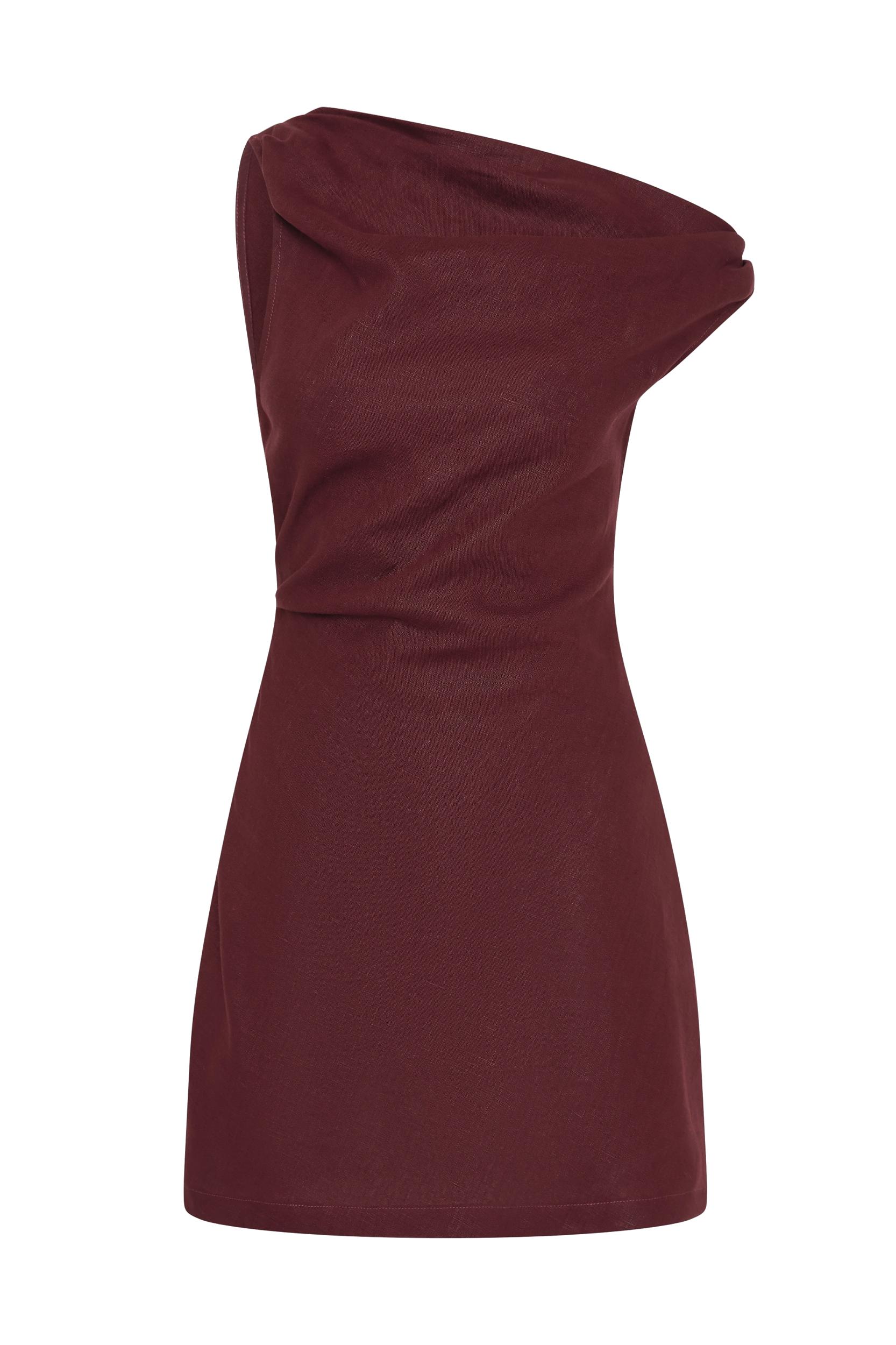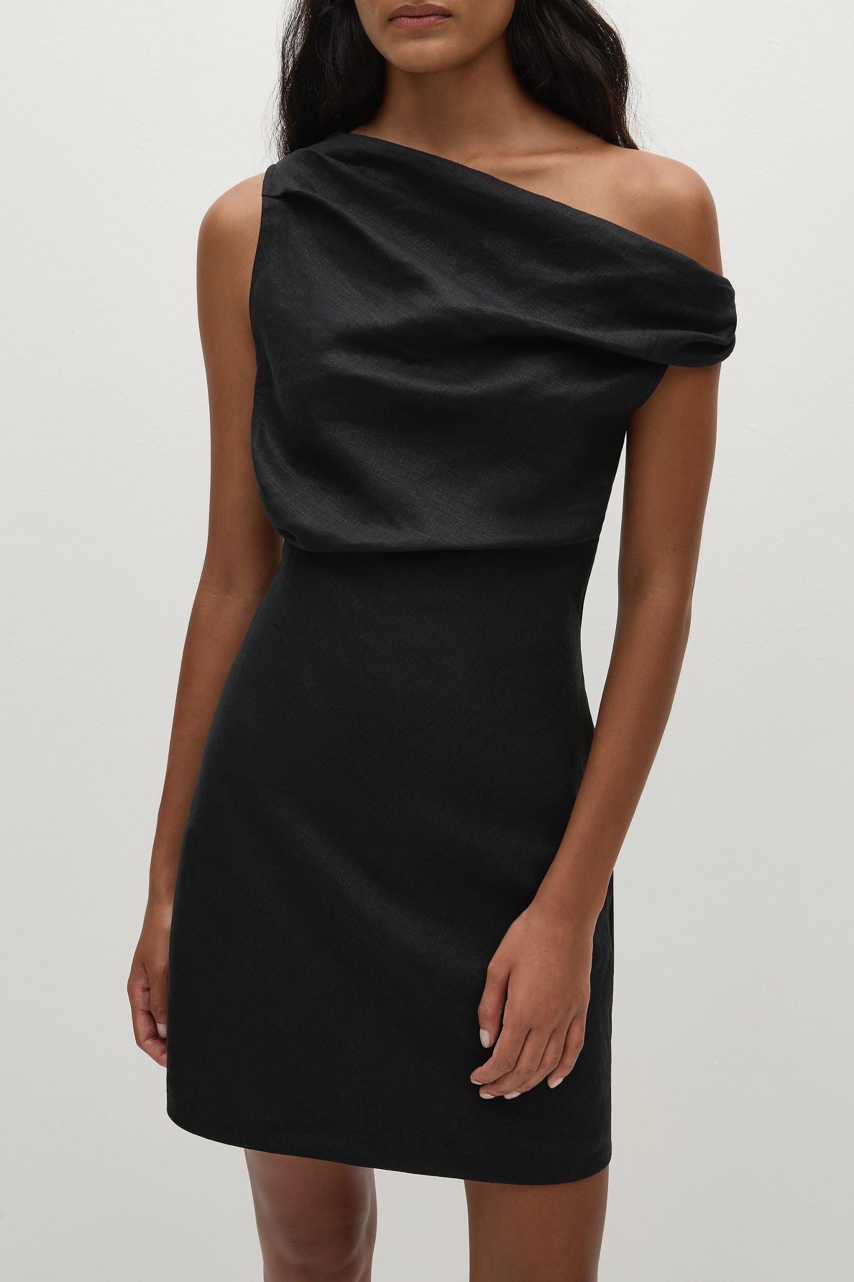 A timeless mini dress, designed from a signature 100% European Flax® linen fabrication in a classic black. It features an asymmetric one-shoulder neckline with gathering and drape details across the front bodice. Cinching in slightly at the waist, it is a relaxed silhouette that flares out into a short A-line skirt. Style with a simple sandal for day to night dressing. This style is true to size. There is no elastic woven into the fabric so it does not offer any additional stretch.