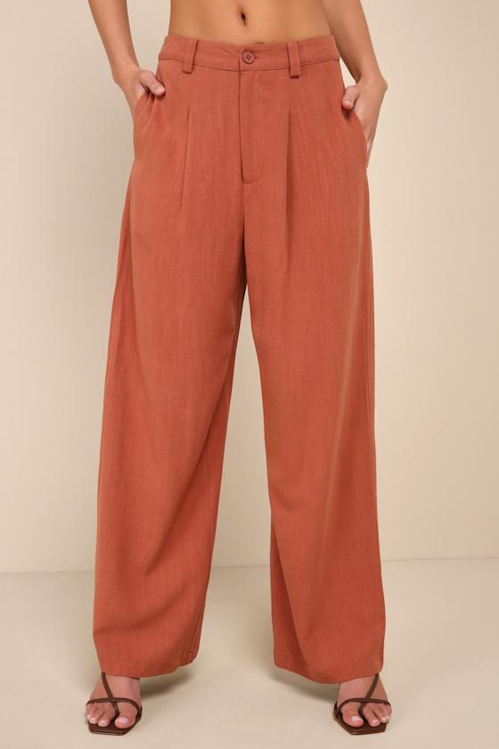 Confidence and charm will be easy to come by when you've got the Lulus Suits You Perfectly Terracotta Linen Wide-Leg Pants! Lightweight linen-blend fabric shapes these elevated pants that have a high waist, belt loops, and a hidden zip fly with top button closure. Wide legs boast subtle pleated details and side seam pockets, finishing at full-length hems. Pair with the matching top for a complete look!