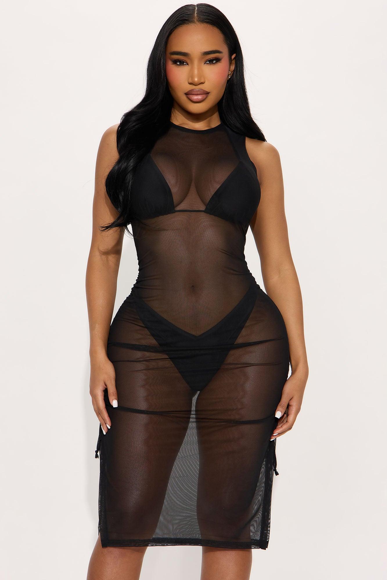Available In Black. Swim Cover Up Maxi Dress Mesh Ruching Detail Full Stretch Final Sale 95% Polyester 5% Spandex Imported California Proposition 65WARNING: Cancer and Reproductive Harm - www.P65Warnings.ca.gov.