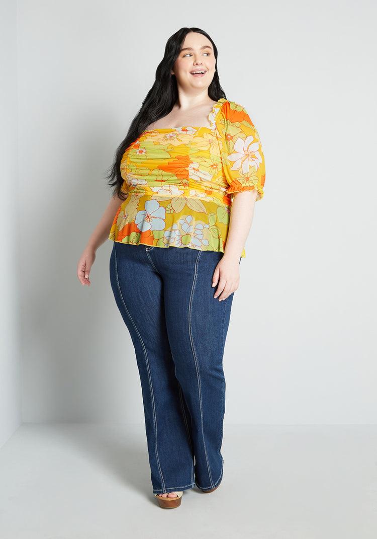 Whether you’re making an escape uptown, upstate, or to the opposite coast, this flirty yellow blouse is a must-pack item for your next getaway thanks to its soft mesh fabrication, vintage-inspired design, and exclusive hand-drawn floral print plastered all over. Shirring at the fitted bodice, short puff sleeves with elasticized ruffle cuffs, ruffle-trim at the square-neckline, a smocked panel at the back for ease of fit, and a subtle peplum hem, show how this ultra-feminine shirt was thoughtfully designed just for you. With tropical flowers in shades of pale yellow, baby blue, orange, and lime green, with red outlining throughout, atop a sunshine yellow-hued background, this ModCloth namesake label top goes the summer style distance as it can be worn for any occasion that gets you a little more dressed up than usual and out of the house! Shell: 92% Nylon, 8% Spandex. Lining: 94% Polyester, 6% Spandex. Machine wash. Sheer sleeves and panel. Imported Fabric provides stretch. Shirring at back. S=20 inches Length 1X=22 inches Length