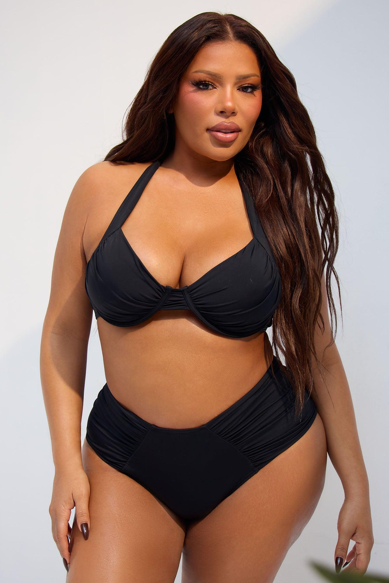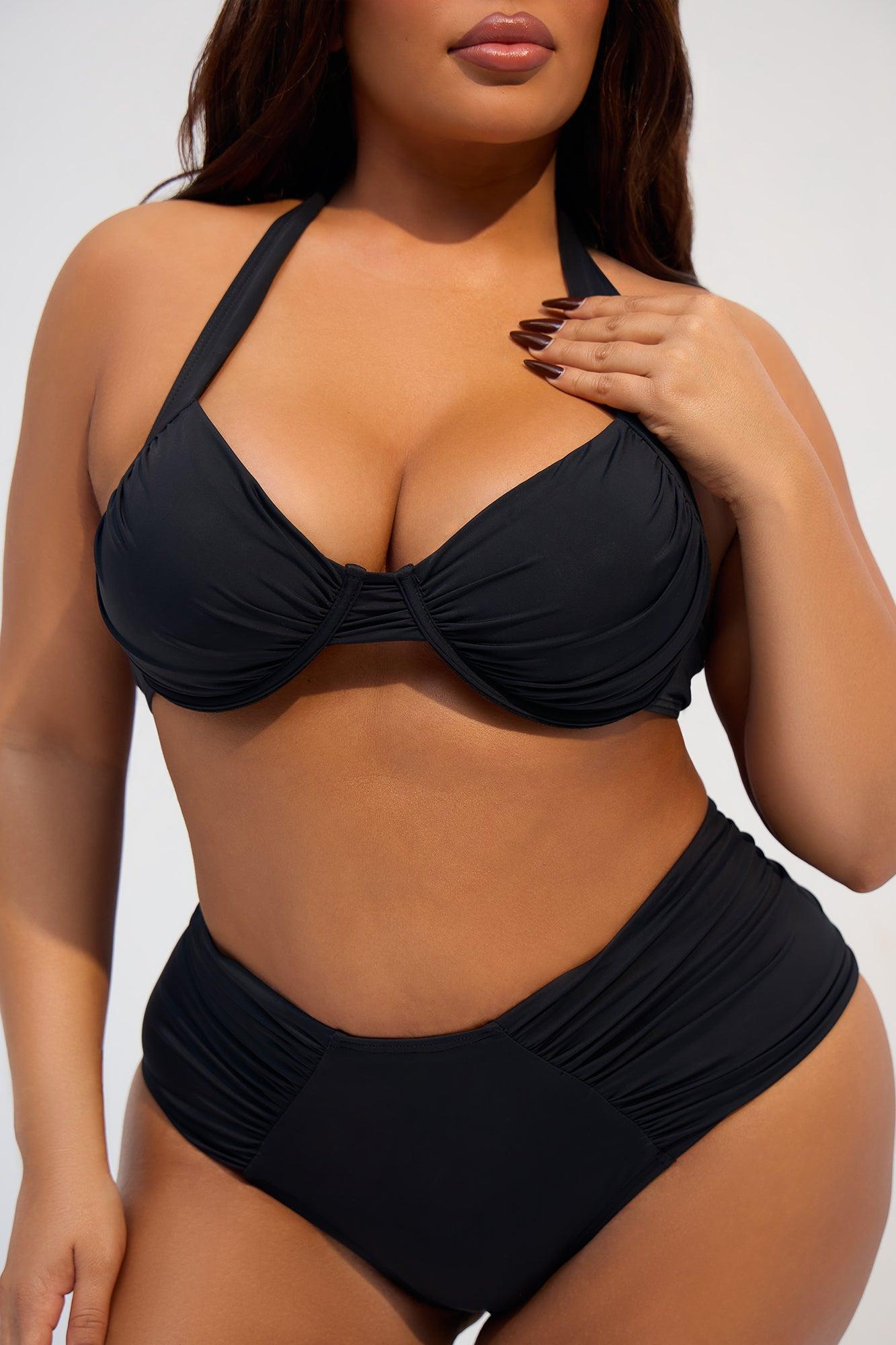Available In Black. 2 Piece Bikini Underwire Top Non Padded Halter Neck Ties Ruching Detail Bikini Bottom High Waist Cheeky Full Stretch Final Sale Shell: 82% Nylon 18% Spandex Lining: 90% Polyester 10% Spandex Imported