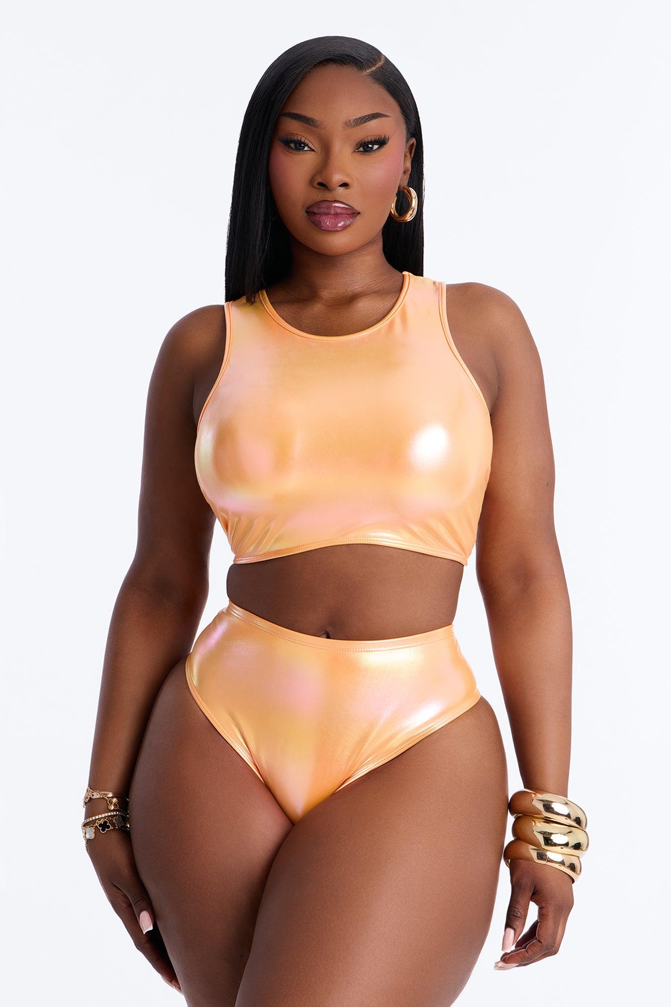 Available In Orange. 2 Piece Ensemble Bikini Shimmer Racerback Bikini Top Removable Cups Bikini Bottom High Leg Cut Cheeky Full Stretch Final Sale Shell: 82% Nylon 18% Spandex Lining: 88% Polyester 12% Spandex Imported California Proposition 65WARNING: Cancer and Reproductive Harm - www.P65Warnings.ca.gov.