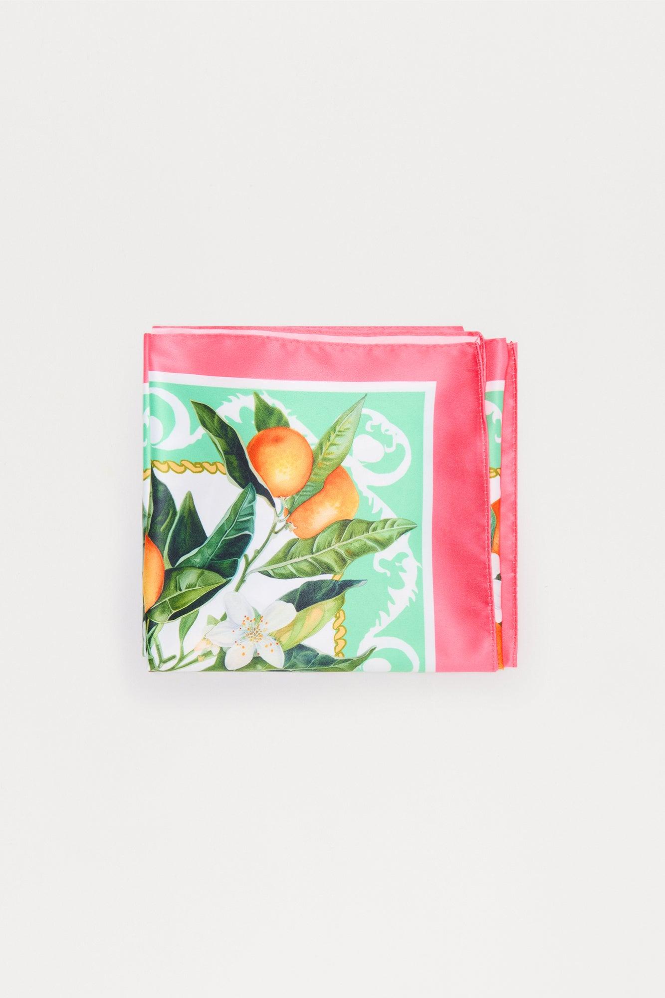 Available In Green/combo. Head Scarf Fruit Detail Silky Material Dimension: 70x70 cm 100% Polyester Imported