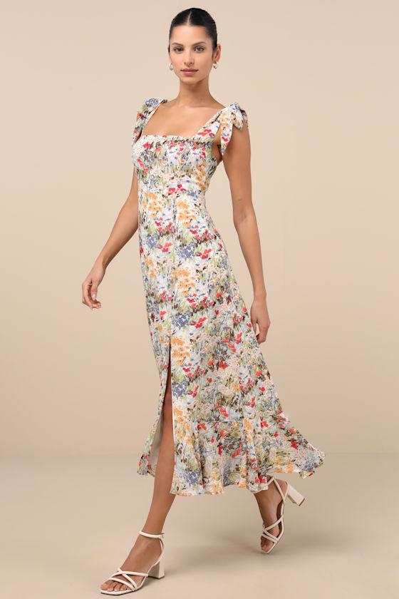 RSVP with the sweetest style of the season thanks to the Lulus Summer Invite White Multi Floral Tie-Strap Tiered Midi Dress! A wildflower-inspired print adorns airy woven chiffon as it shapes this ethereal dress that falls from tying shoulder straps into a straight neckline and a fitted, seamed bodice. The high, fitted waist sits atop a figure-skimming A-line skirt with a tiered, ankle-grazing midi hem. Trendy smocking at the back.