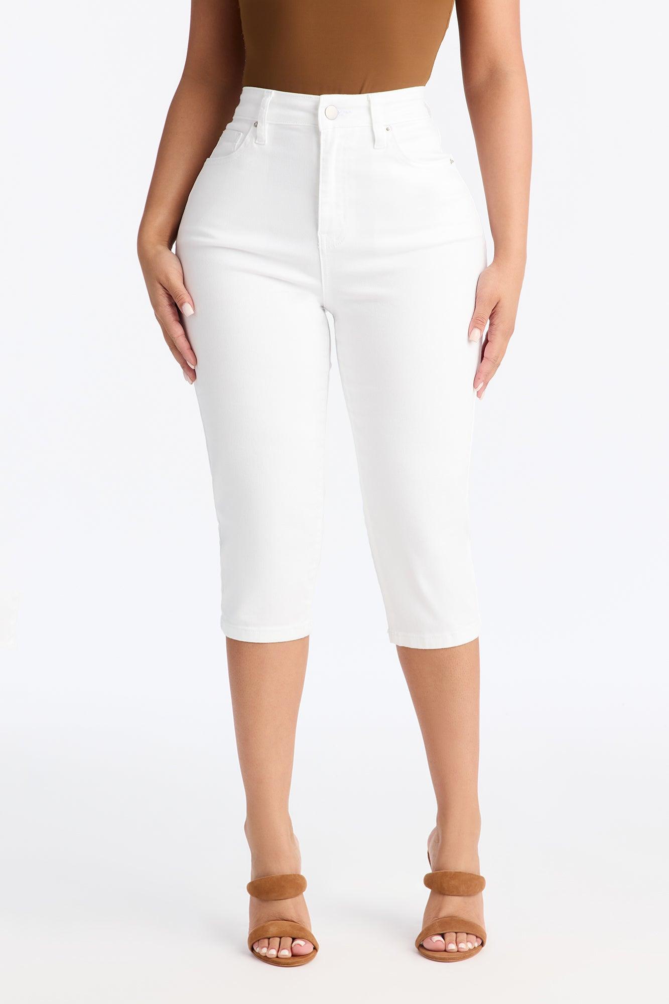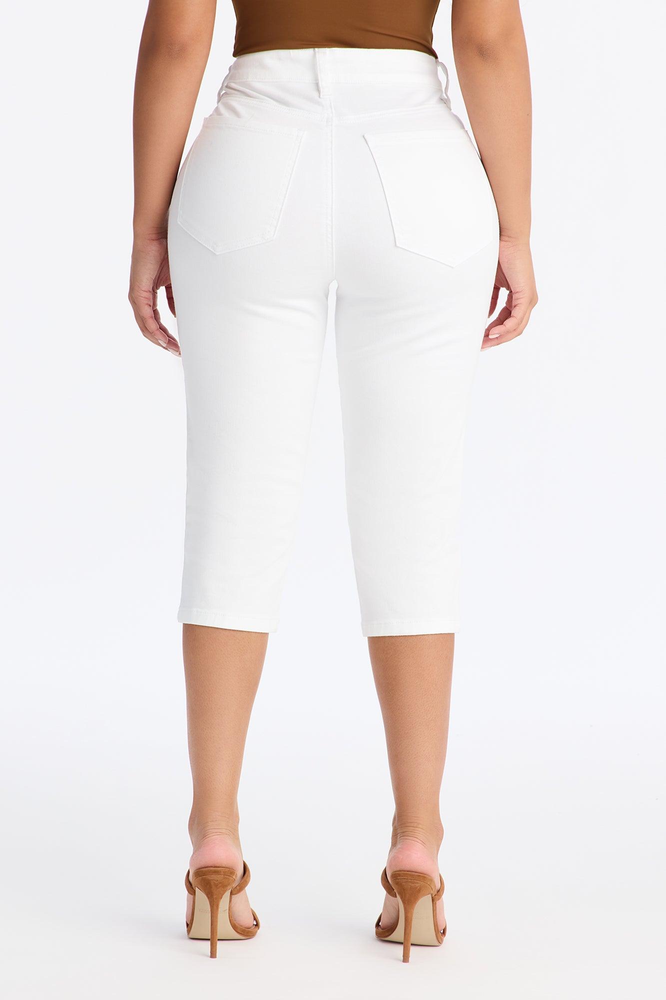 Available In White. Pedal Pusher Jean 5 Pocket 11" High Rise 17" Inseam Medium Stretch Disclaimer: Due To The Specialized Wash Process, Each Garment Is Unique. Self: 98% Cotton 2% Spandex Imported Available In Plus Sizes