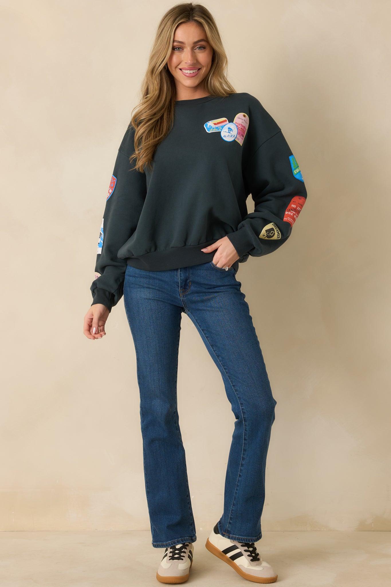 Bring a little wanderlust wherever you go in the Summit Souvenirs Vintage Black Cotton Ski Patch Crewneck Sweatshirt. Decorated with colorful ski patch graphics that feel like keepsakes from every mountain you’ve ever conquered, this cozy crewneck is made for winter road trips, lodge lounging, and all your “book the trip” moments. This vintage black crewneck sweatshirt features a soft fleece interior, ribbed trim, and multi-colored ski patch graphics placed along the chest and down the sleeves. Relaxed fit. 100% Cotton Unlined Hand Wash Cold Manufactured in the USA Designed in the USA Model is 5'8" and wearing size S/M