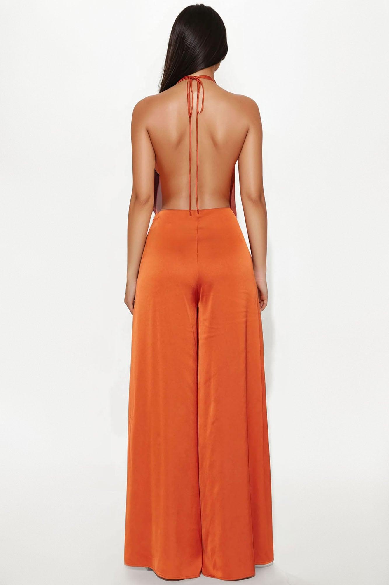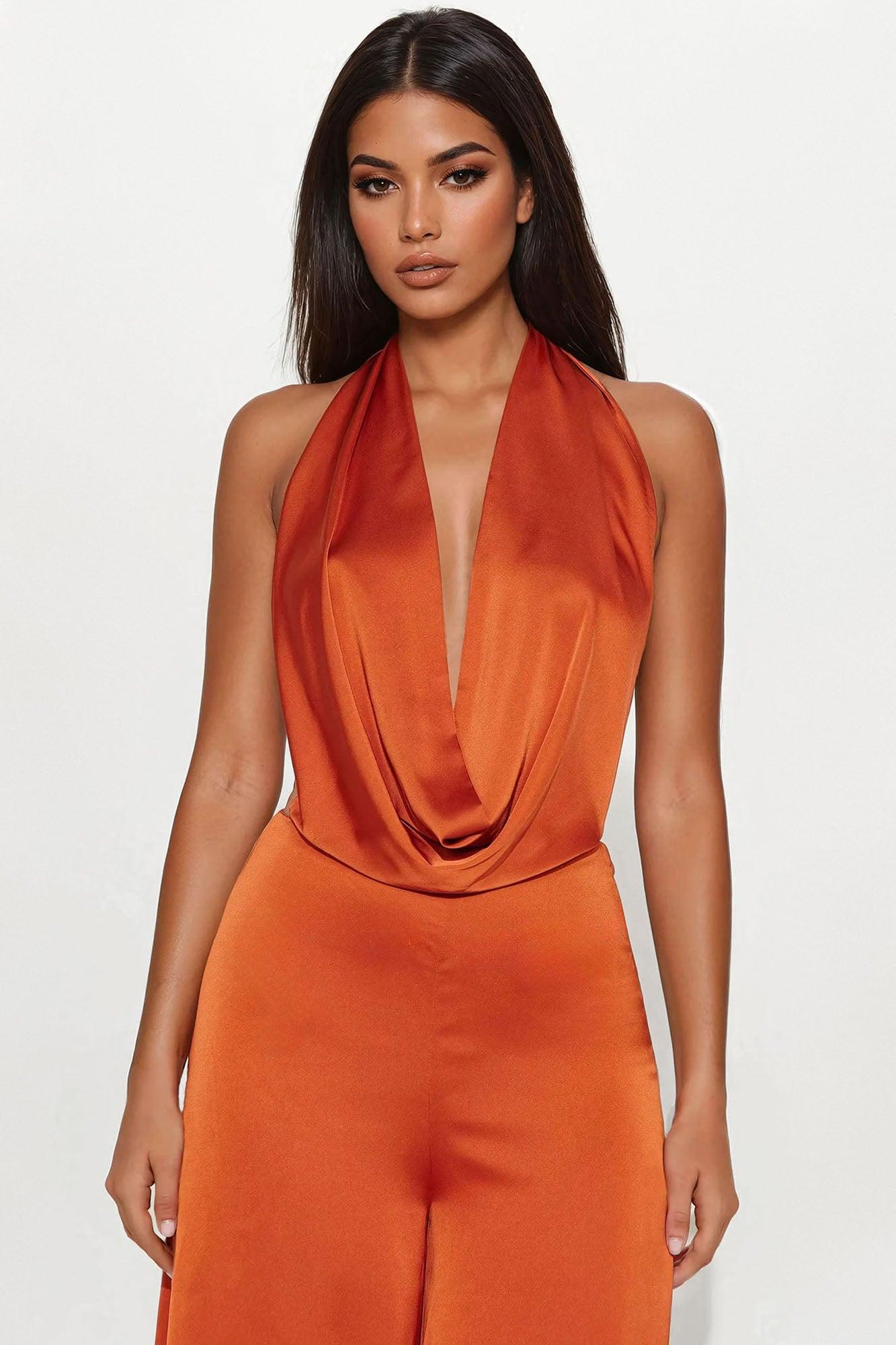 Sun and Sips Solid Satin Jumpsuit - Cognac