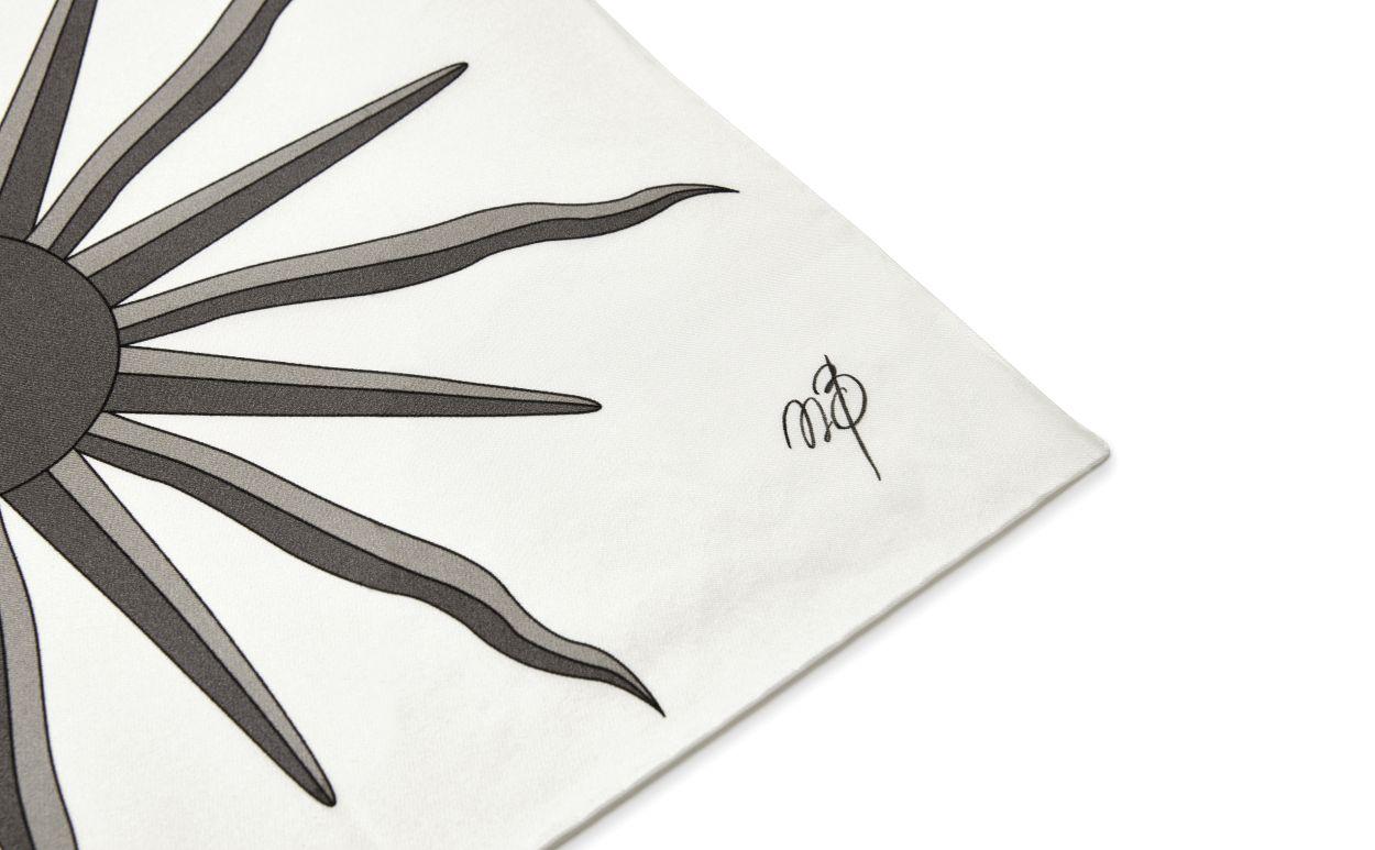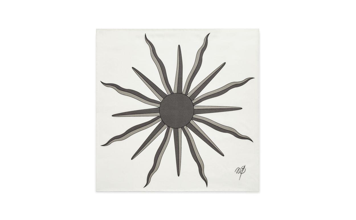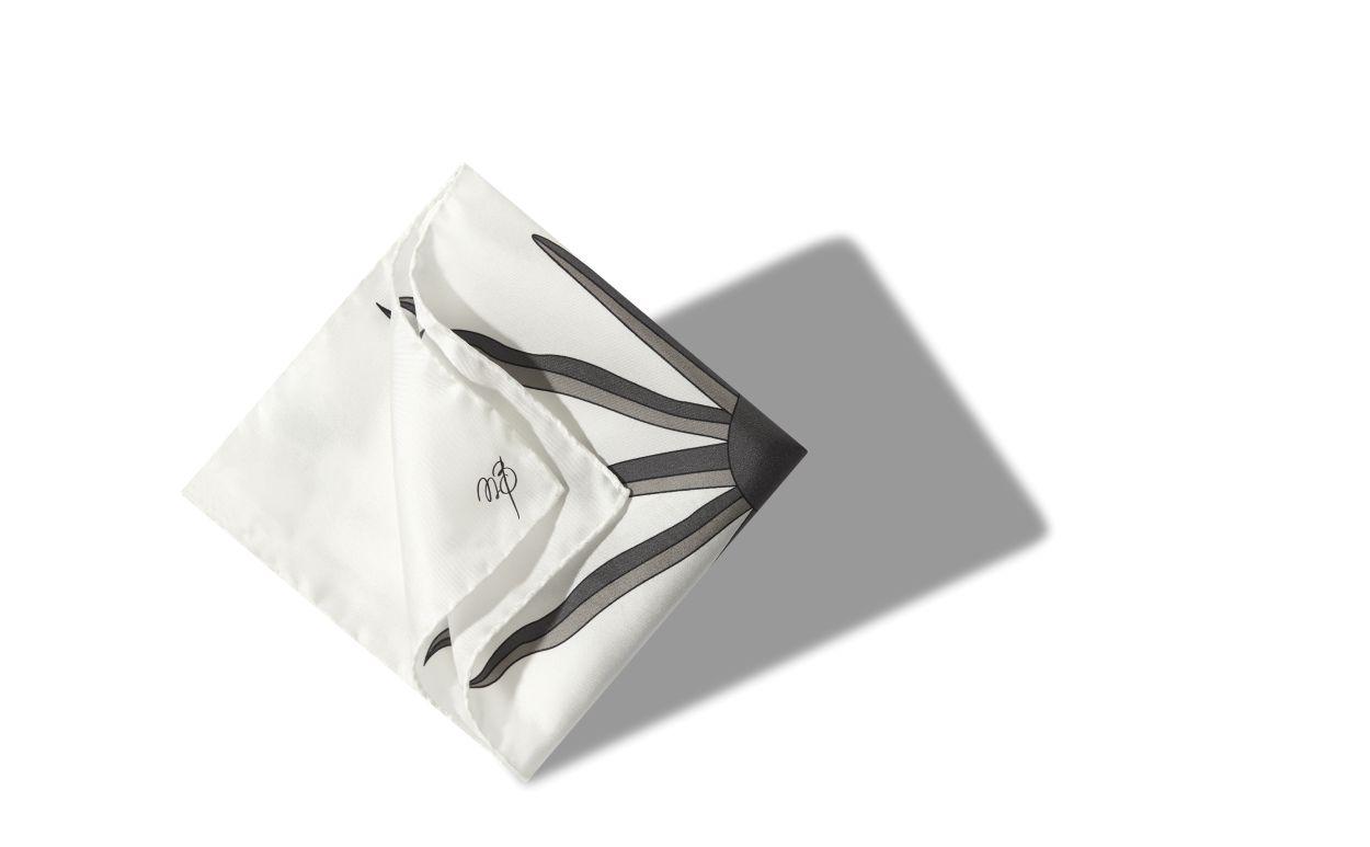 Ivory silk pocket square featuring charcoal grey sunburst print design, rolled finish and Manolo Blahnik signature logo.
