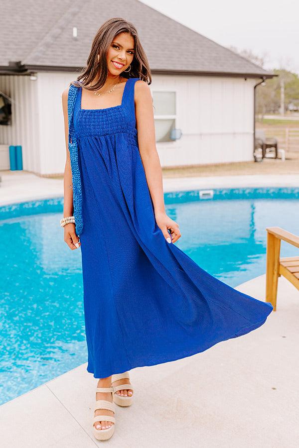 – Perfect for strolling on the sand on a brisk summer morning – Unlined, stretchy material in a royal blue color – Smocked bodice with unfinished seam detailing – Straight neckline and back – Sleeveless 2-inch shoulder straps – Hidden side pockets – Relaxed silhouette that cascades into a straight hemline Measurements S : Bust 32", Hip 42", Length 49.5", Waist 38". M : Bust 34", Hip 44", Length 50", Waist 40". L : Bust 36", Hip 46", Length 51", Waist 42". XL : Bust 38", Hip 48", Length 51.5", Waist 44".