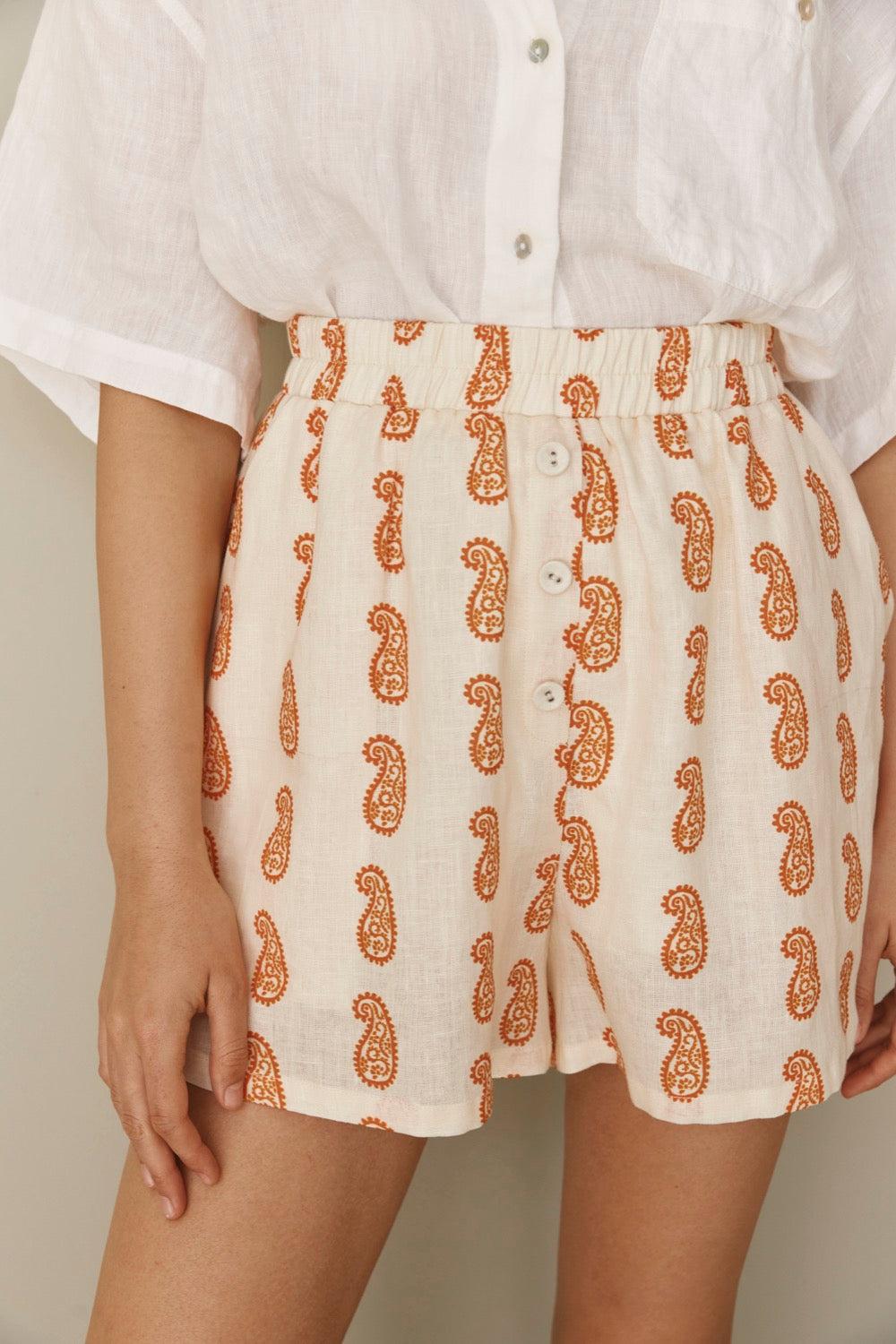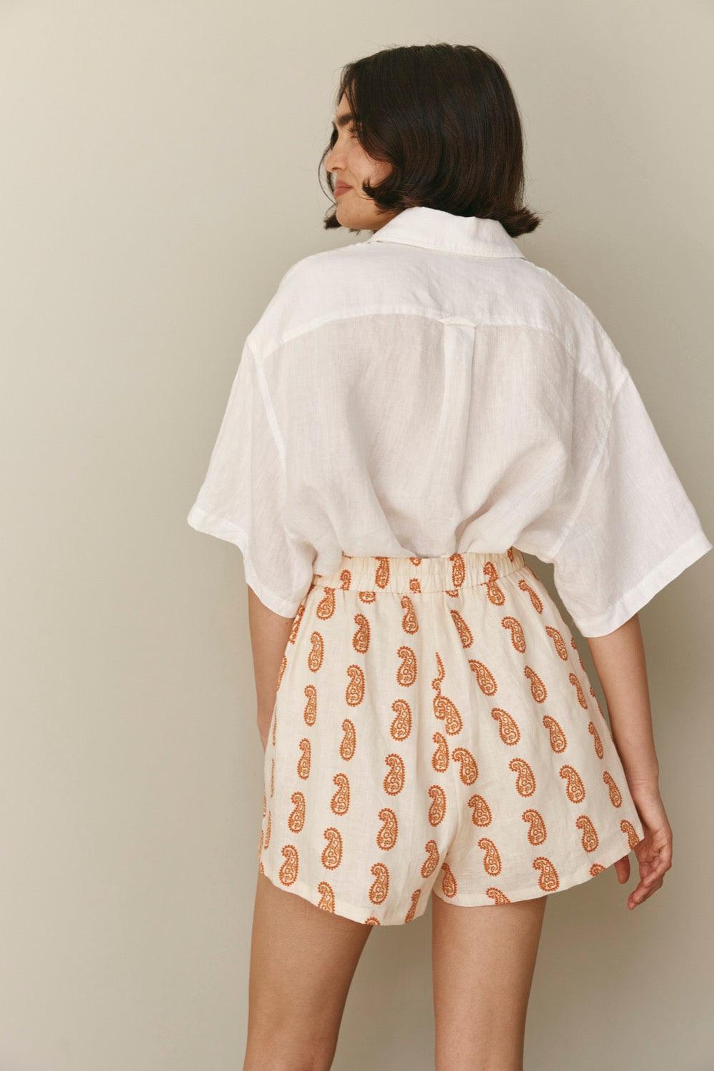 Elevate your Sunday mornings with these Sun Seeker Shorts. Made from 100% linen, this breathable fabric will keep you cool all summer. For a complete coordinated look, pair them with the matching vest. Details Centre front button detailing Side pockets 100% Linen Cold Hand Wash / Cool Iron On Reverse As this is a light coloured fabric we recommend wearing this with nude undergarments Size & Fit Length 37cm / 14.5in (taken from a size AU 8 waist to hem) Runs true to size Model wears size AU 8 Model height 174cm / 5ft 8in