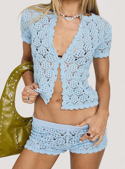 Crochet matching set Button-up top, round neckline, cap sleeves, micro shorts, elasticated waistband, pocketless, mesh, low-rise fit Non-stretch material, unlined 60% cotton 40% acrylic Cold gentle machine wash