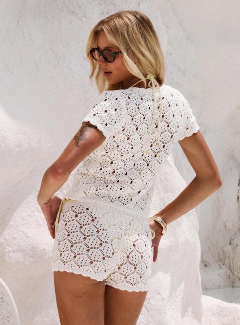 Crochet matching set Button-up top, round neckline, cap sleeves, micro shorts, elasticated waistband, pocketless, mesh, low-rise fit Non-stretch material, unlined 60% cotton 40% acrylic Cold gentle machine wash Length of size US 2 / AU 6 waist to hem: 28cm / 11in