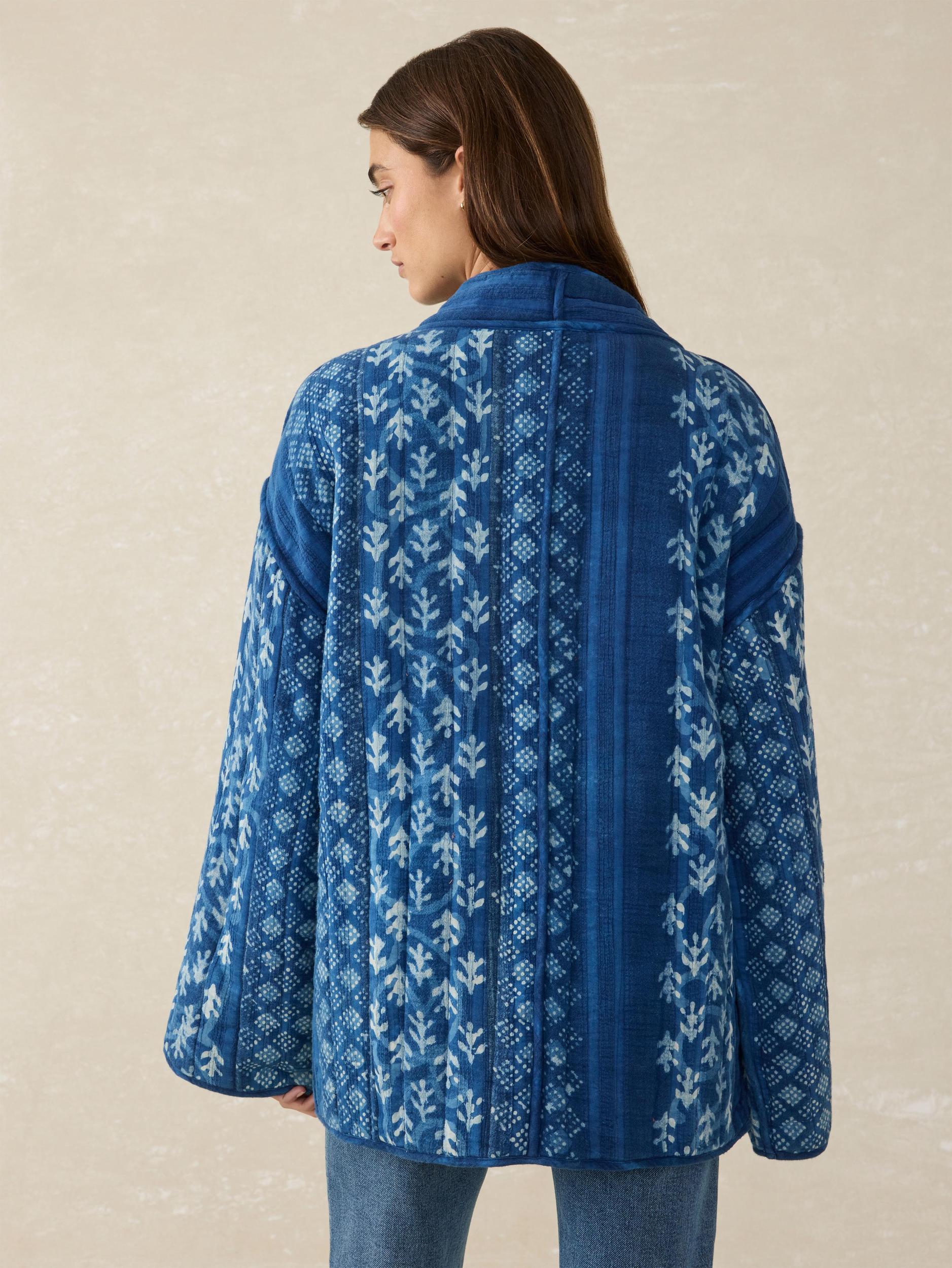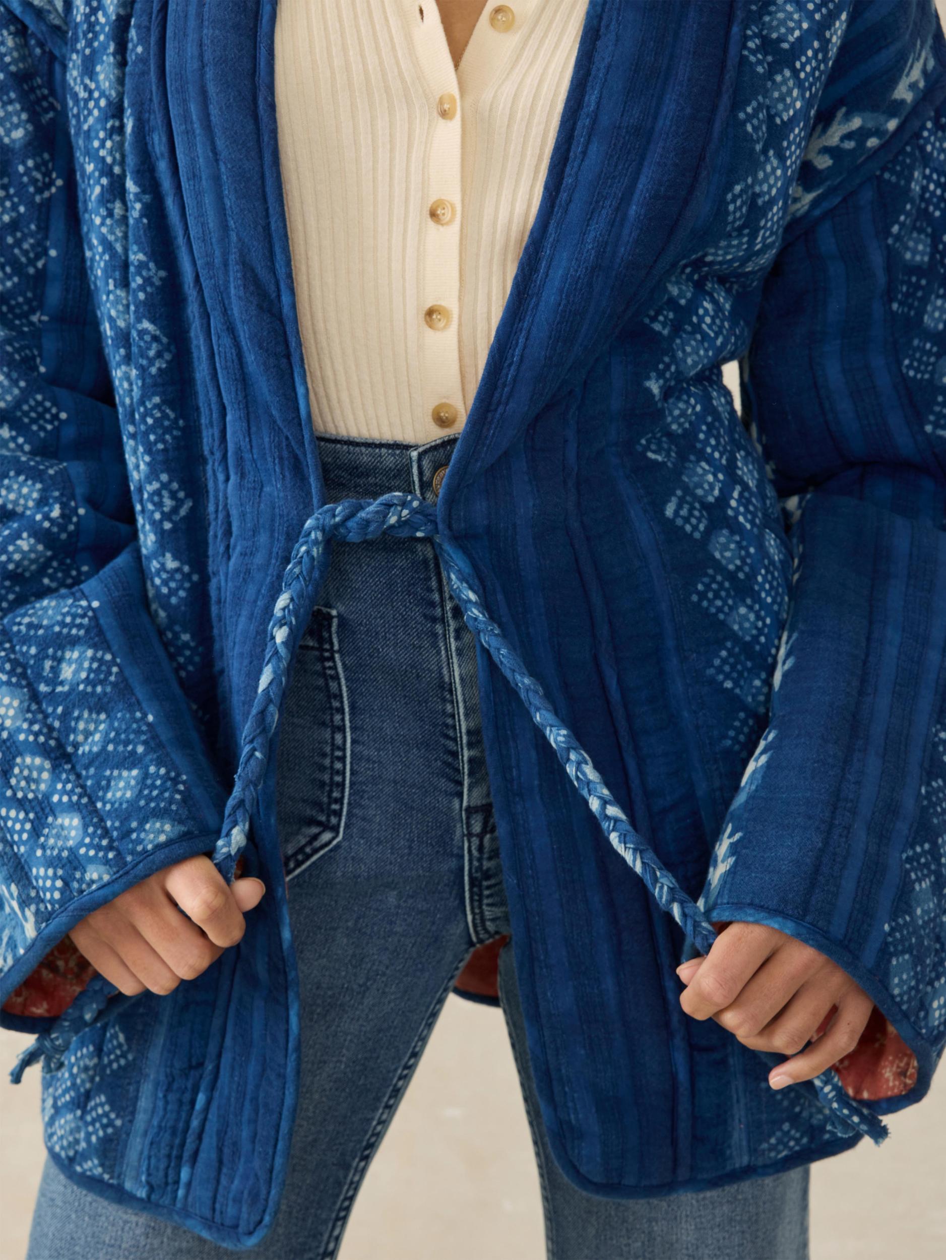 Transform your spring outfits with this quilted jacket, showcasing a beautifully crafted quilted pattern of hand blocked bandana prints in rich indigo hues. The braided tie closure adds a unique touch, while slant pockets at the front provide practicality without compromising on style. Hand-printed with genuine indigo. Wash separately as color may transfer. Fit: Oversized Fit, Length: 29½" Detail: Vertical quilted stitching layout. Braided tie closure. Slant pockets at front. Hand-done block print at exterior and bandana printed interior. Material: 100% Organic Cotton Model: Lexi is 5'7 wearing size Small Care: Turn inside out. Machine wash cold with like colors. Gentle cycle. Do not bleach. Tumble dry low. Remove promptly. Cool iron when needed. WOS2510-IDV