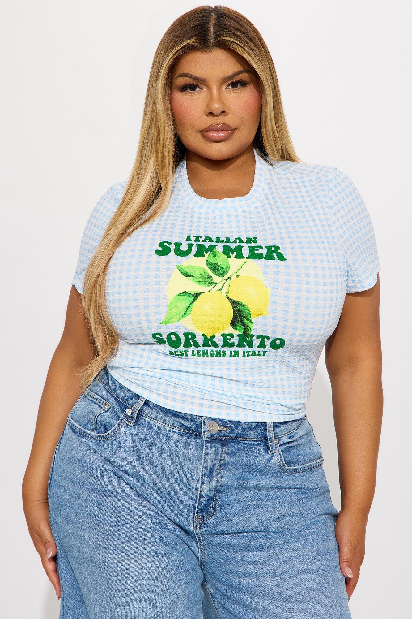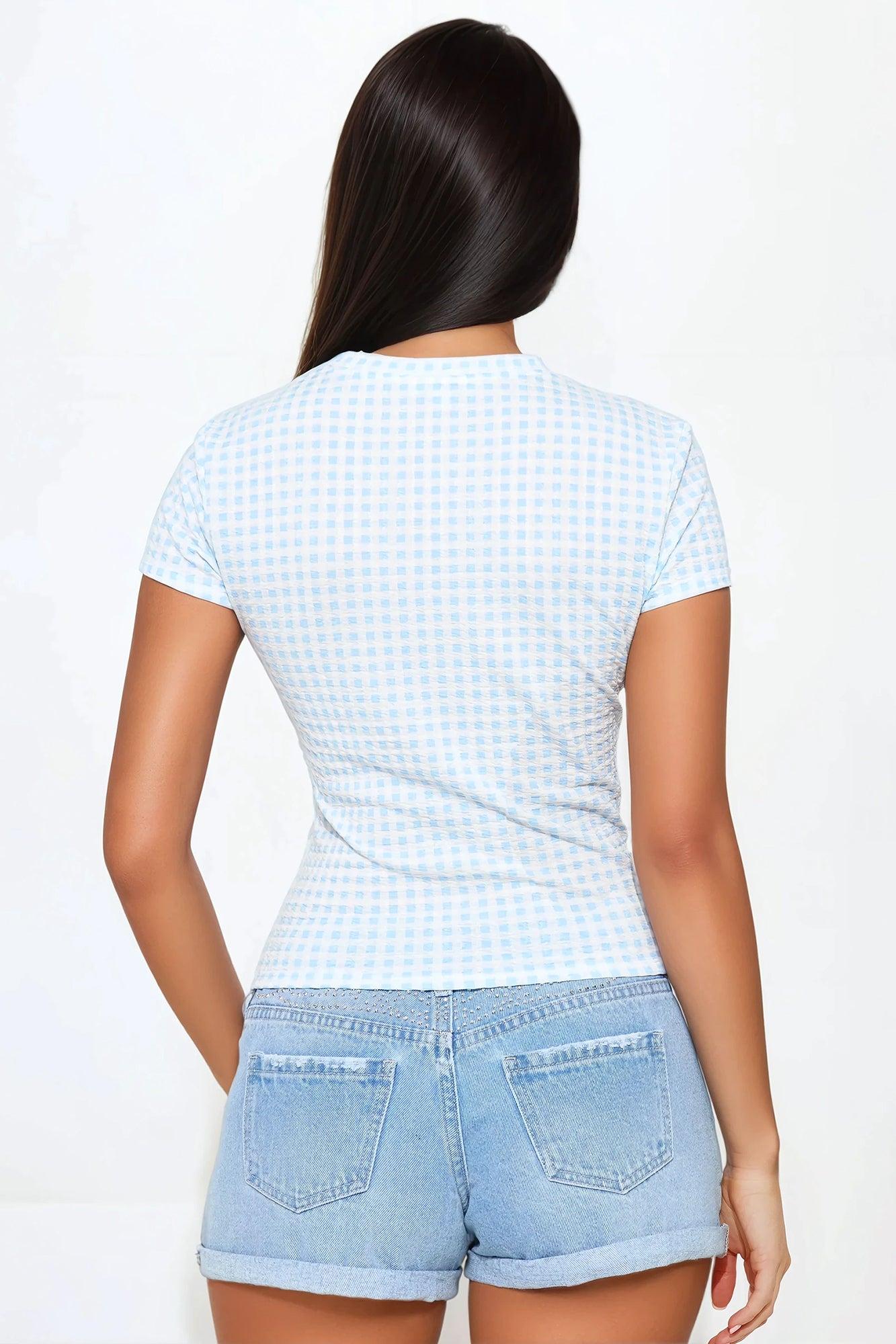 Available In Light Blue. Crew Neck Short Sleeve Front Screen Gingham Print Stretch Disclaimer: Due To The Printing Process A Difference In Saturation May Occur. Each Garment Is Unique. 98% Polyester 2% Spandex Imported California Proposition 65 WARNING: Cancer and Reproductive Harm - www.P65Warnings.ca.gov.