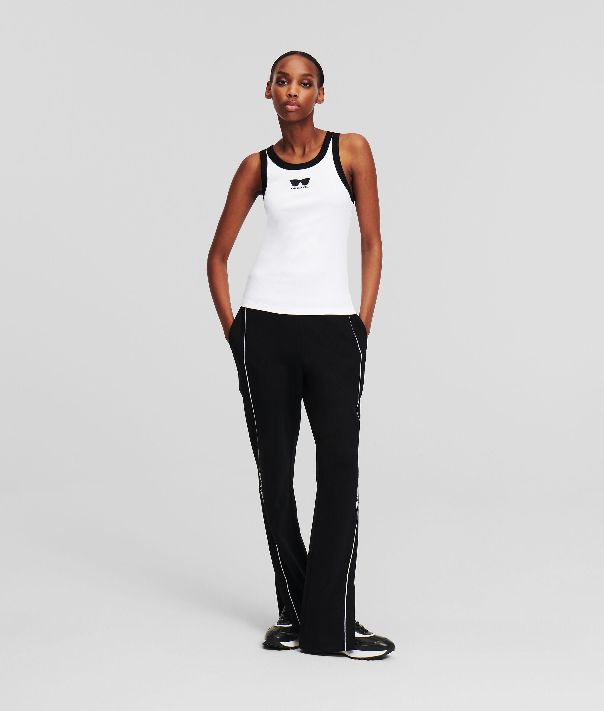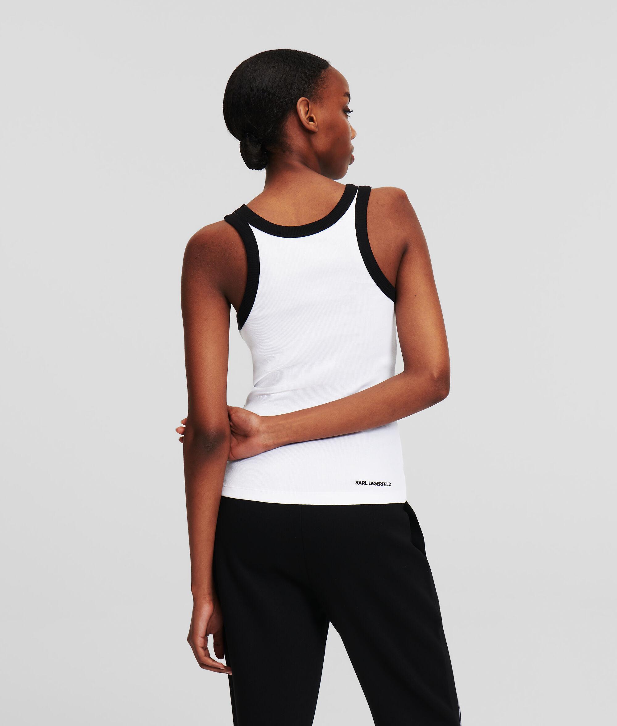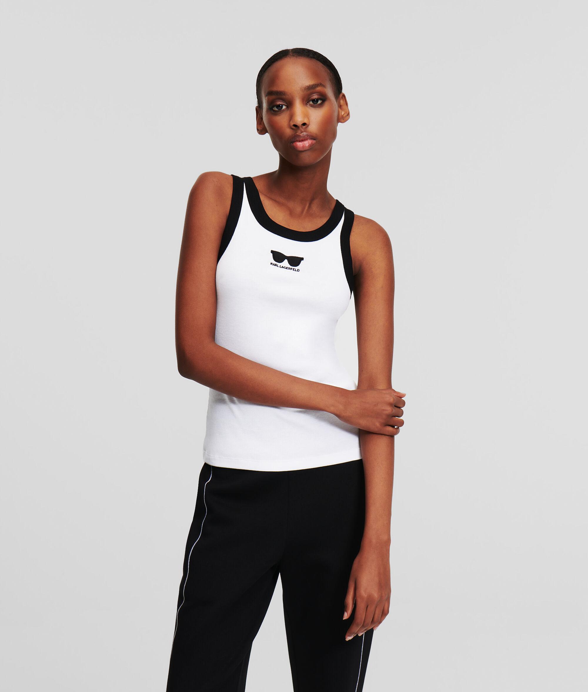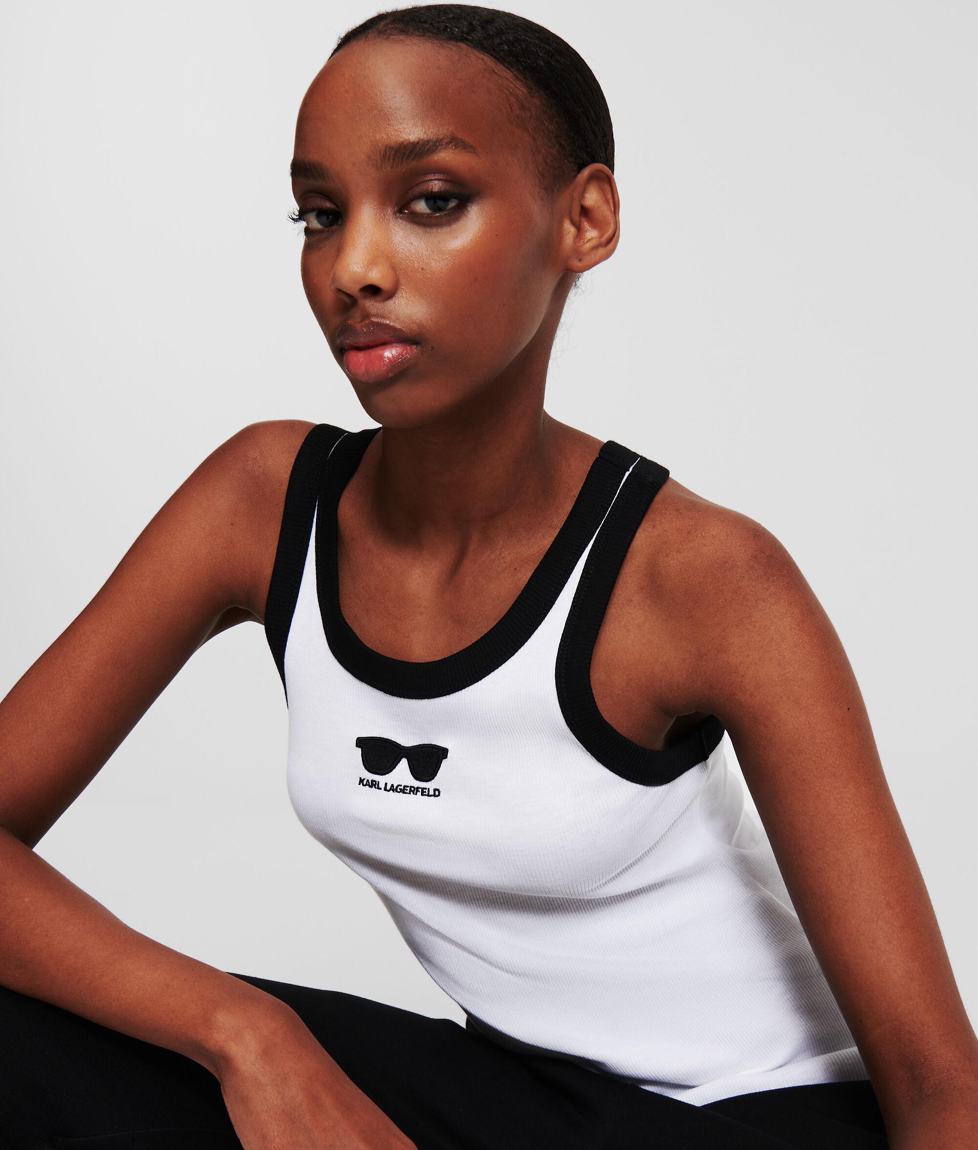 Made from organic cotton, this tank top offers a sleek sleeveless silhouette complemented by subtle contrast rib detailing. The embroidered sunglasses motif acts as a playful homage to Karl Lagerfeld's timeless style.