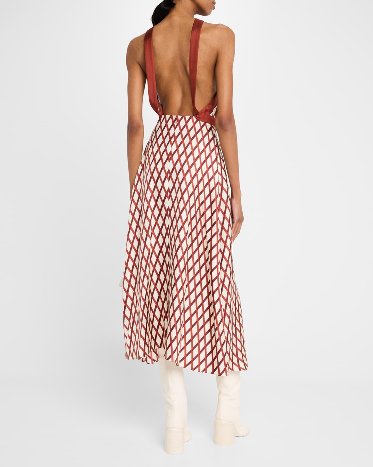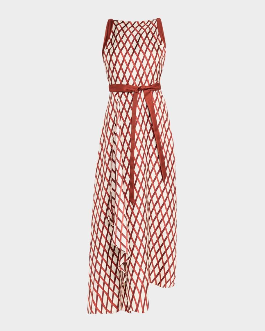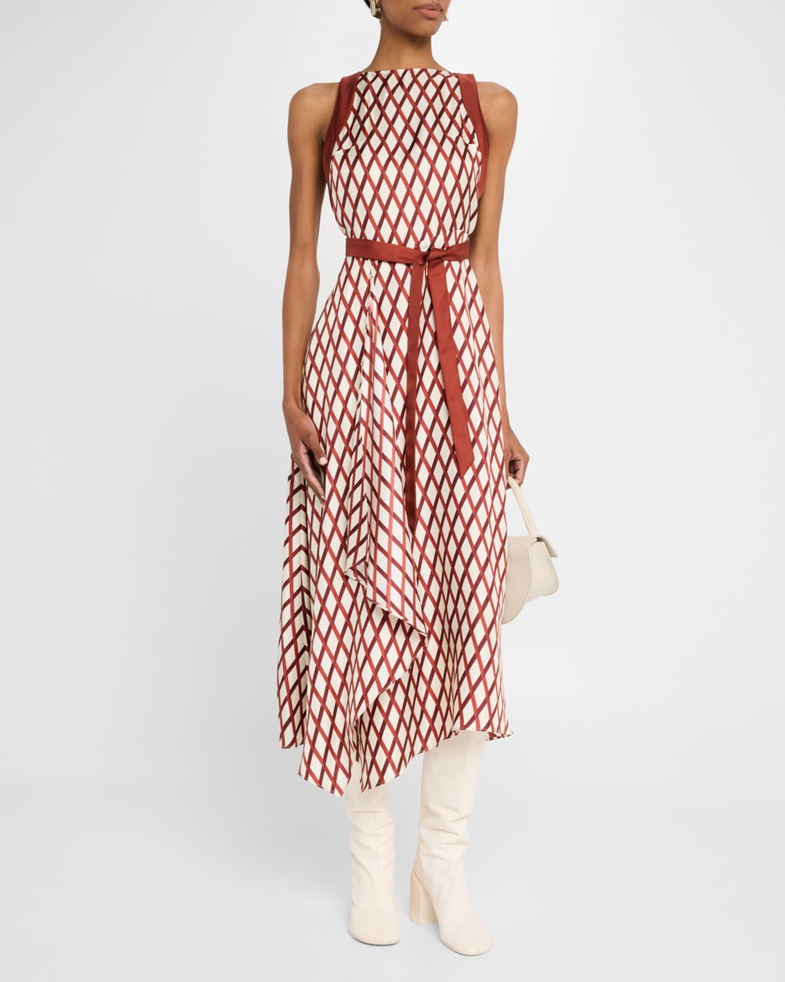 Adam Lippes "Sunita" silk twill dress in diamond grid motif High neckline; open-back Sleeveless Hem falls below the knee A-line silhouette Asymmetric hme Silk Dry clean Made in USA