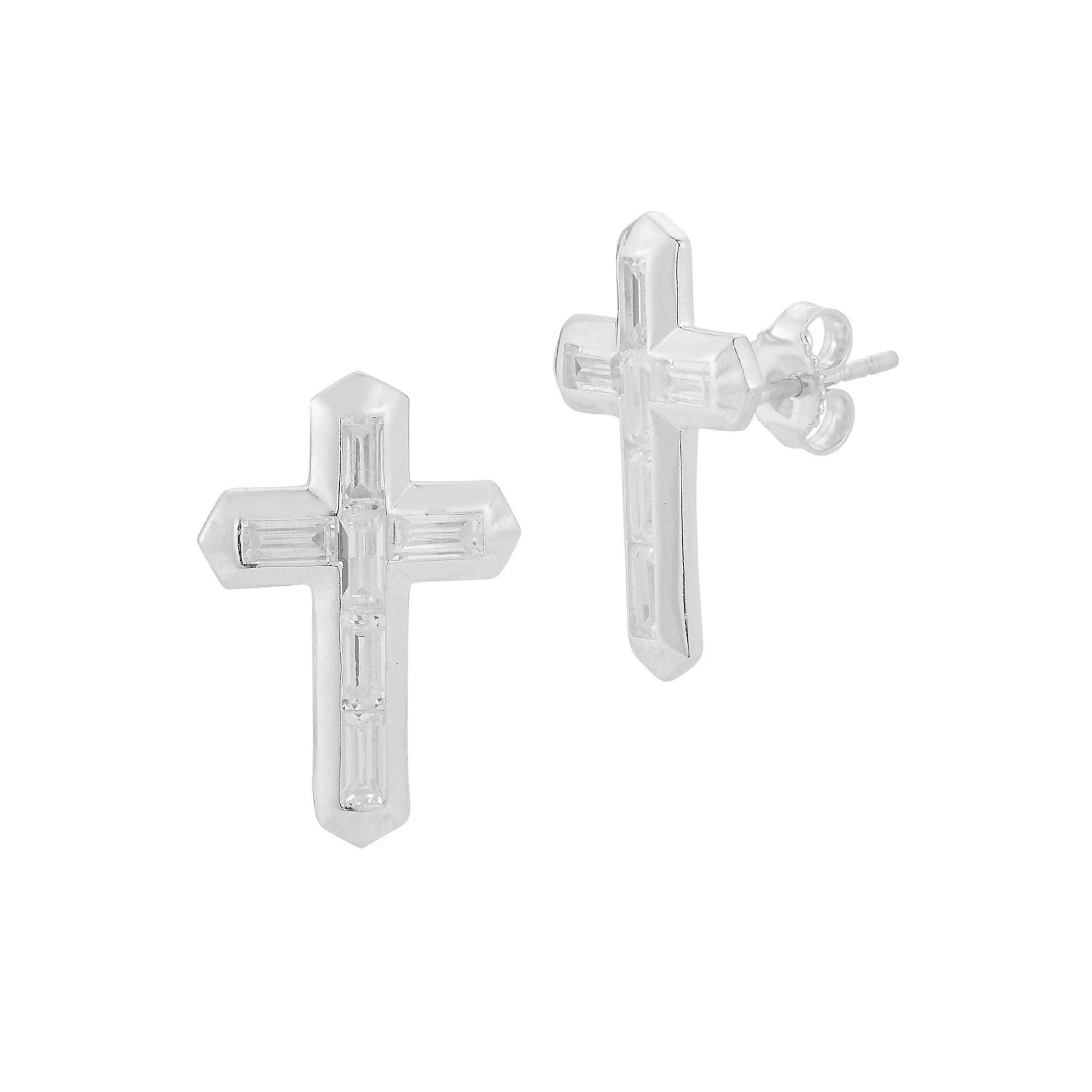 These cubic zirconia cross statement stud earrings by Sunkissed Sterling beautifully display your faith. These cubic zirconia cross statement stud earrings by Sunkissed Sterling beautifully display your faith. Metal: sterling silver Backings: post Packaging: pouch Plating: rhodium, 14k gold Finish: polished Length: 0.5L X 0.8WSTONE DETAILS Stone type: cubic zirconia Shape: baguette Setting: bezel Gemstones may have been treated to enhance their appearance. Special care may be required. Please visit our Gemstone Treatment & Special Care Guide for more information. Size: One Size. Gender: female. Age Group: adult.