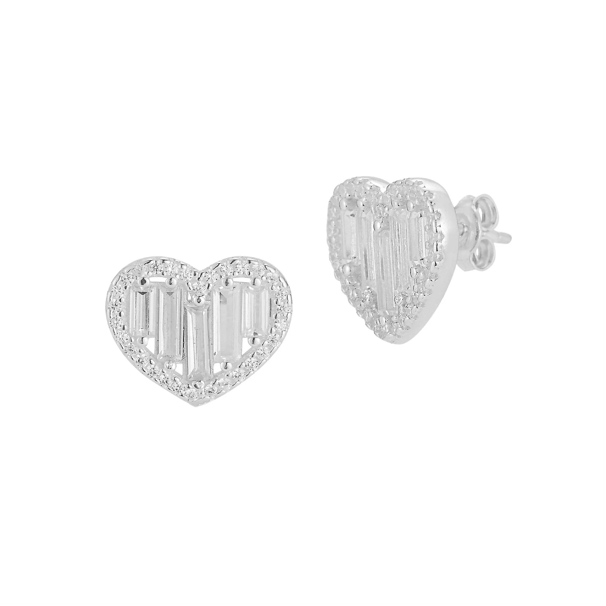Achieve strikingly beautiful style with these cubic zirconia heart stud earrings by Sunkissed Sterling. Achieve strikingly beautiful style with these cubic zirconia heart stud earrings by Sunkissed Sterling. Metal: sterling silver Backings: post Packaging: pouch Plating: rhodium, 14k gold Finish: polished Diameter: 0.42L x 56WSTONE DETAILS Stone type: cubic zirconia Shape: baguette, round Setting: prong Gemstones may have been treated to enhance their appearance. Special care may be required. Please visit our Gemstone Treatment & Special Care Guide for more information. Size: One Size. Gender: female. Age Group: adult.