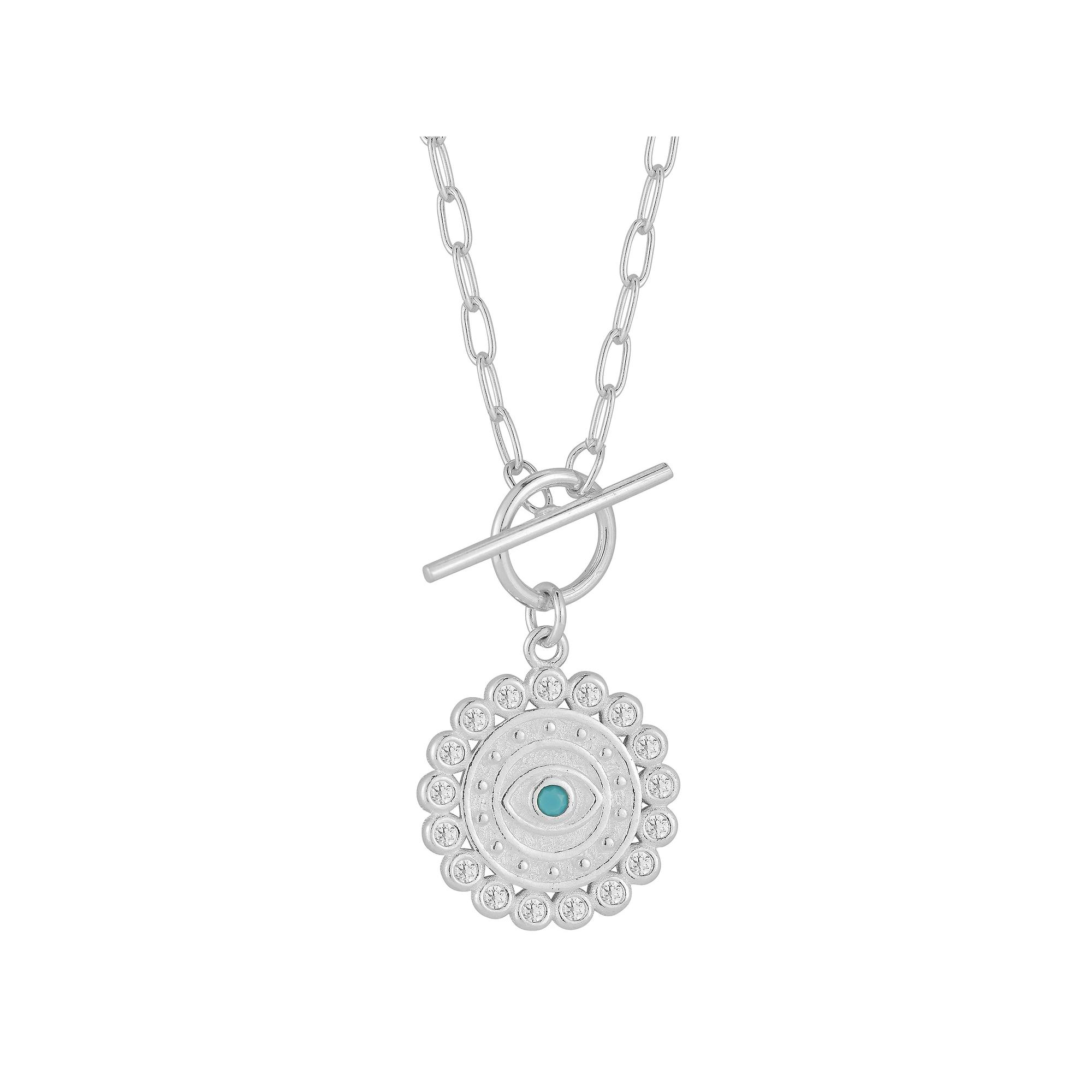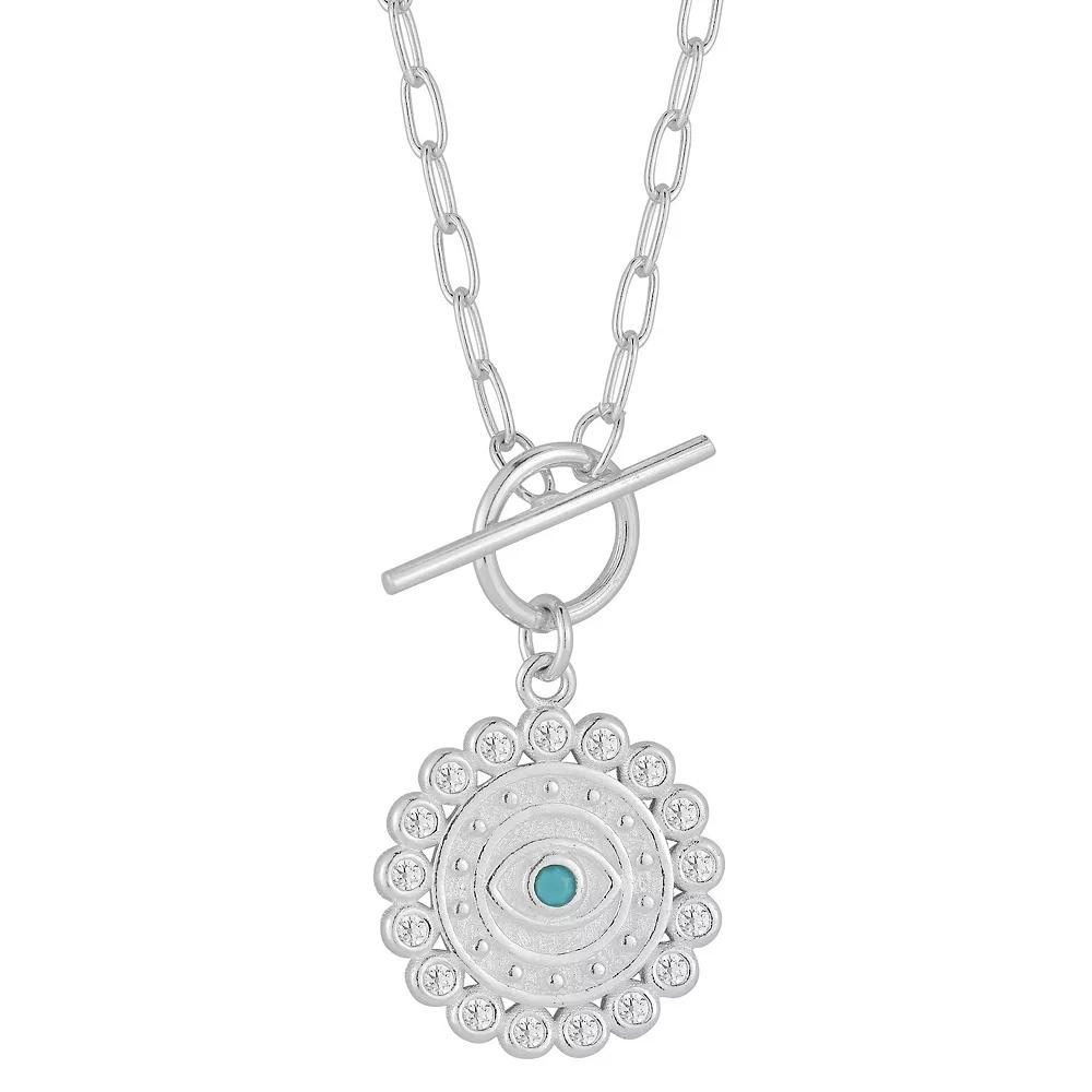 Make a fashion statement with this stunning Sunkissed Sterling cubic zirconia and turquoise Evil Eye medallion toggle necklace. Click on this JEWELRY & WATCHES GUIDE to learn about fit, styles, materials and more! Make a fashion statement with this stunning Sunkissed Sterling cubic zirconia and turquoise Evil Eye medallion toggle necklace. Click on this JEWELRY & WATCHES GUIDE to learn about fit, styles, materials and more! FEATURES Pendant size: 15.5 mm x 15.5 mm Chain length: 18 in. Chain type: link Closure: toggle Metal: sterling silver Plating: rhodium, 14k gold Finish: polished Packaging: pouchSTONE DETAILS Stone type: cubic zirconia, synthetic Turquoise Center stone size: 2 mm x 2 mm Shape: round Setting: bezel Gemstones may have been treated to enhance their appearance. Special care may be required. Please visit our Gemstone Treatment & Special Care Guide for more information. Gender: female. Age Group: adult.