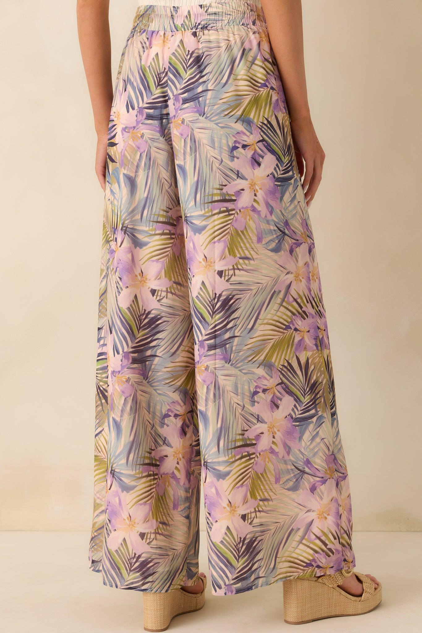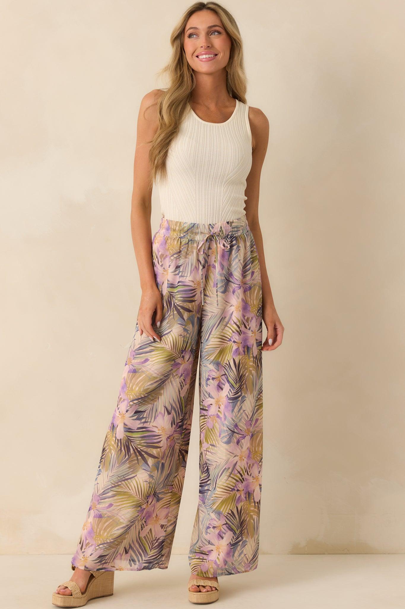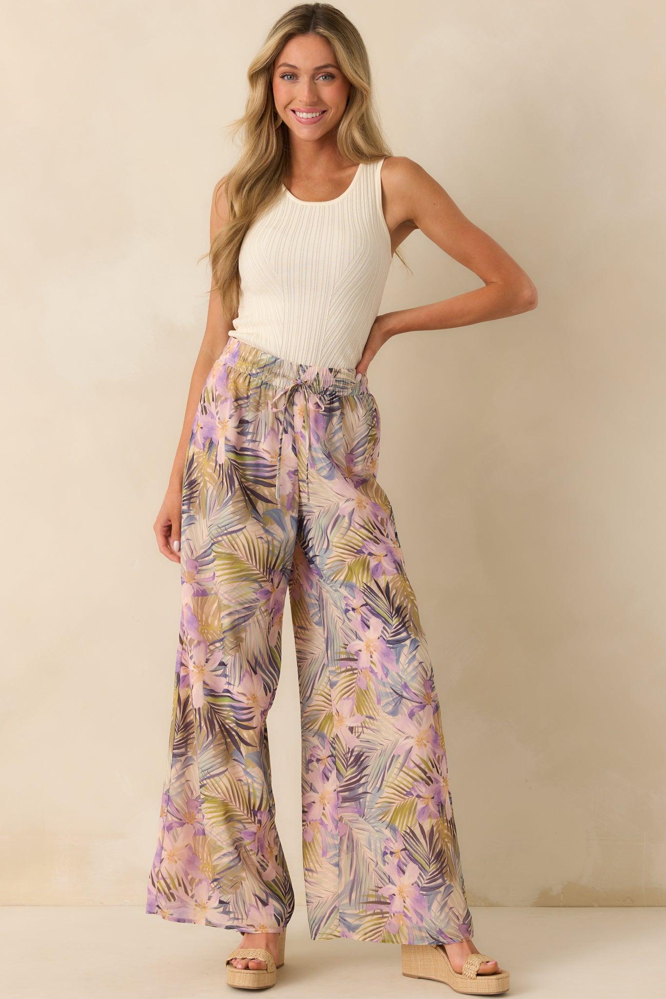 The Sunlight All Around Light Pink Tropical Print Wide Leg Pants are perfect for the days when you want to feel relaxed yet put together. Playful and breezy, they’re ideal for strolls through town, brunch with friends, or simply soaking up the good vibes all day long. These pants feature a tropical green multicolor print chiffon overlay, light pink lining, elastic waistband, adjustable drawstring waist, and a wide leg design.