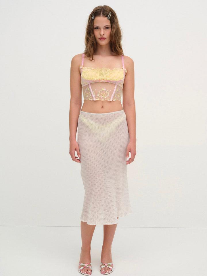 Celebrate the art of feminine charm in the Sunny Bouquet yellow bustier–a mesh bustier adorned with a floral heart and bow embroidered mesh bodice and ruffled dot mesh bust. Spotlighting an elegant slotted ribbon trim and rosette topped bow appliqués, this bustier top was crafted for basking in sunlit gardens.