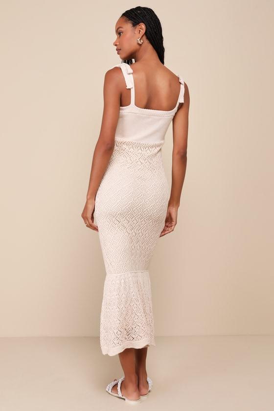 Grab your shades and the Lulus Sunny Choice Beige Tie-Strap Sweater Knit Midi Dress for an unforgettable time! Solid sweater knit creates a fitted bodice with a straight neckline and tying tank straps. Empire-waisted silhouette sits atop a loose-knit figure-hugging skirt with a tiered midi hem.