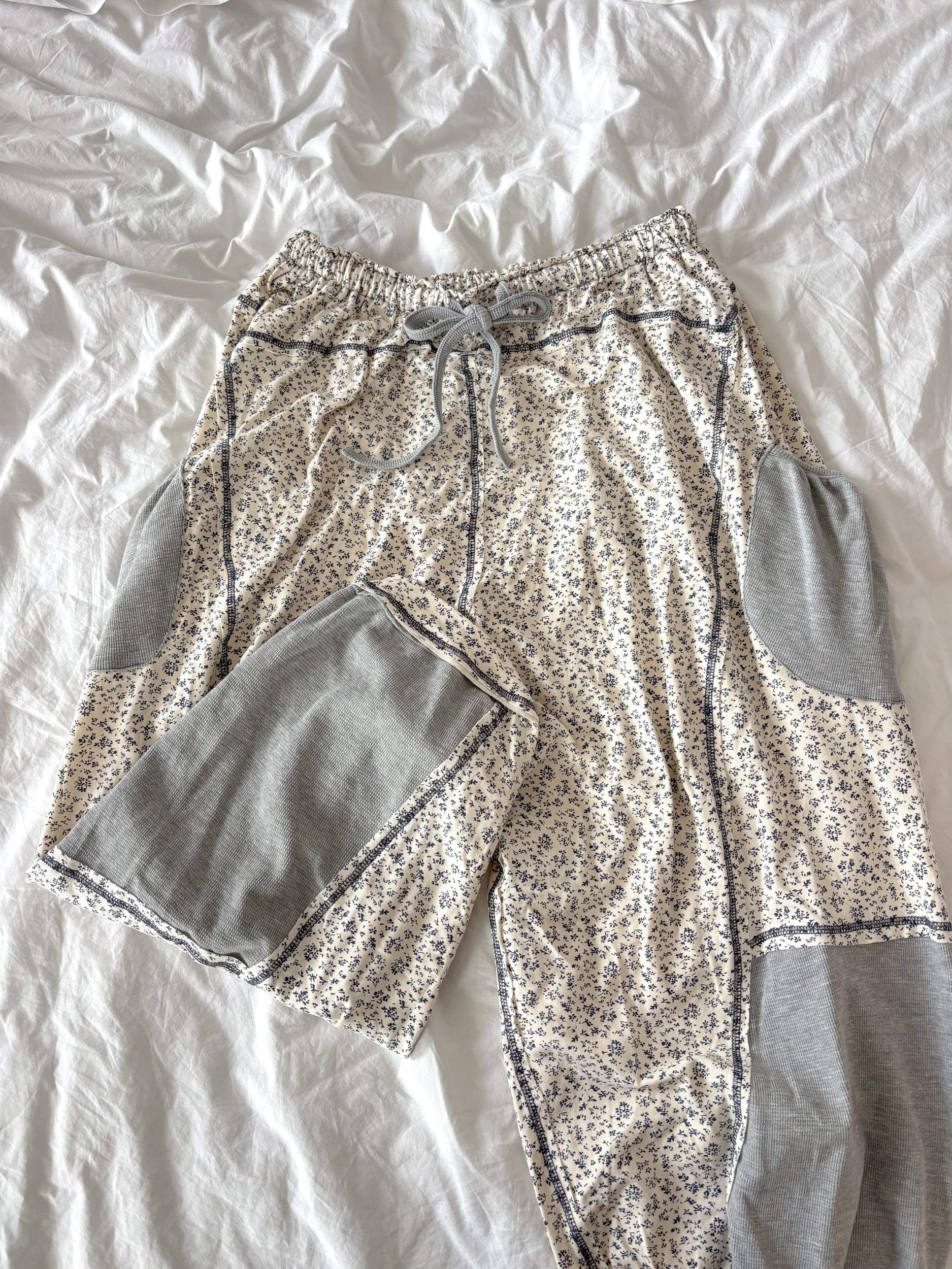 oversized fit in printed knit with overlock stitch detail pointed floral pattern. Fabric Contents: - 92%RAYON 8%SPANDEX Specs/Dimensions: WAIST: 13-1/2"- RISE: (F) 15-1/2", (B) 18-1/2"- THIGH: 18-1/2"- LEG OPENING: 7-3/4"- INSEAM: 22-1/4" MODEL: Nela 5"8 118lbs. Wearing a size Large