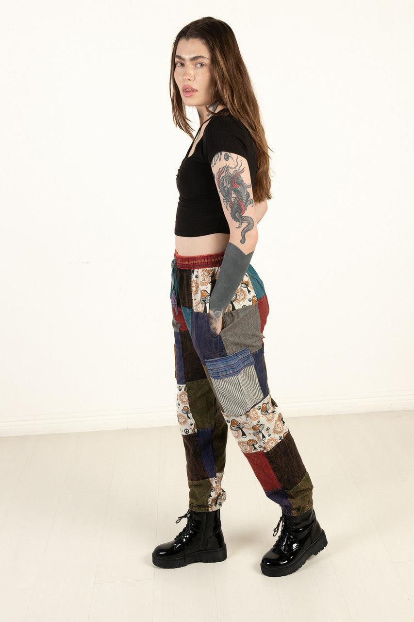 Each pair of pants is handmade and pieced together from different patterns. No two pairs are alike! You will receive a unique item that will vary from the pants pictured here.- Product measurements taken laid flat.- Elastic drawstring waist- Inseam on all sizes 26"