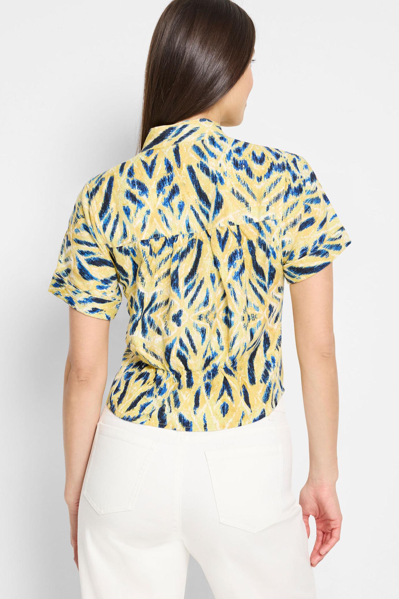 Made from a unique linen blend with all the breathability plus a little extra drape and printed over with the super fun Sunny Skies print. With a stand collar and button placket but pull-on ease, she's as easy to wear as she is to look at. A little extra shaping at the waist keeps the fit feminine. The perfect top for sunny days.