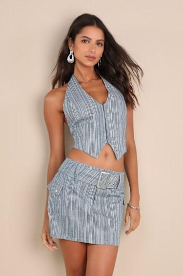 Step out looking cute and coordinated in the Lulus Sunny Theme Blue Striped Belted Cargo Mini Skirt! Sturdy woven cotton fabric, with a striped design throughout, shapes a Y2K-inspired mini skirt with a mid-rise fit, a hidden zip fly with a top button closure, belt loops, and a chunky belt with metal grommets and an oversized metal belt buckle. Cargo-inspired flap pockets sit at the hips and secure with snap-button closures. Mini hem completes the look. Pair with the matching top for a complete look!