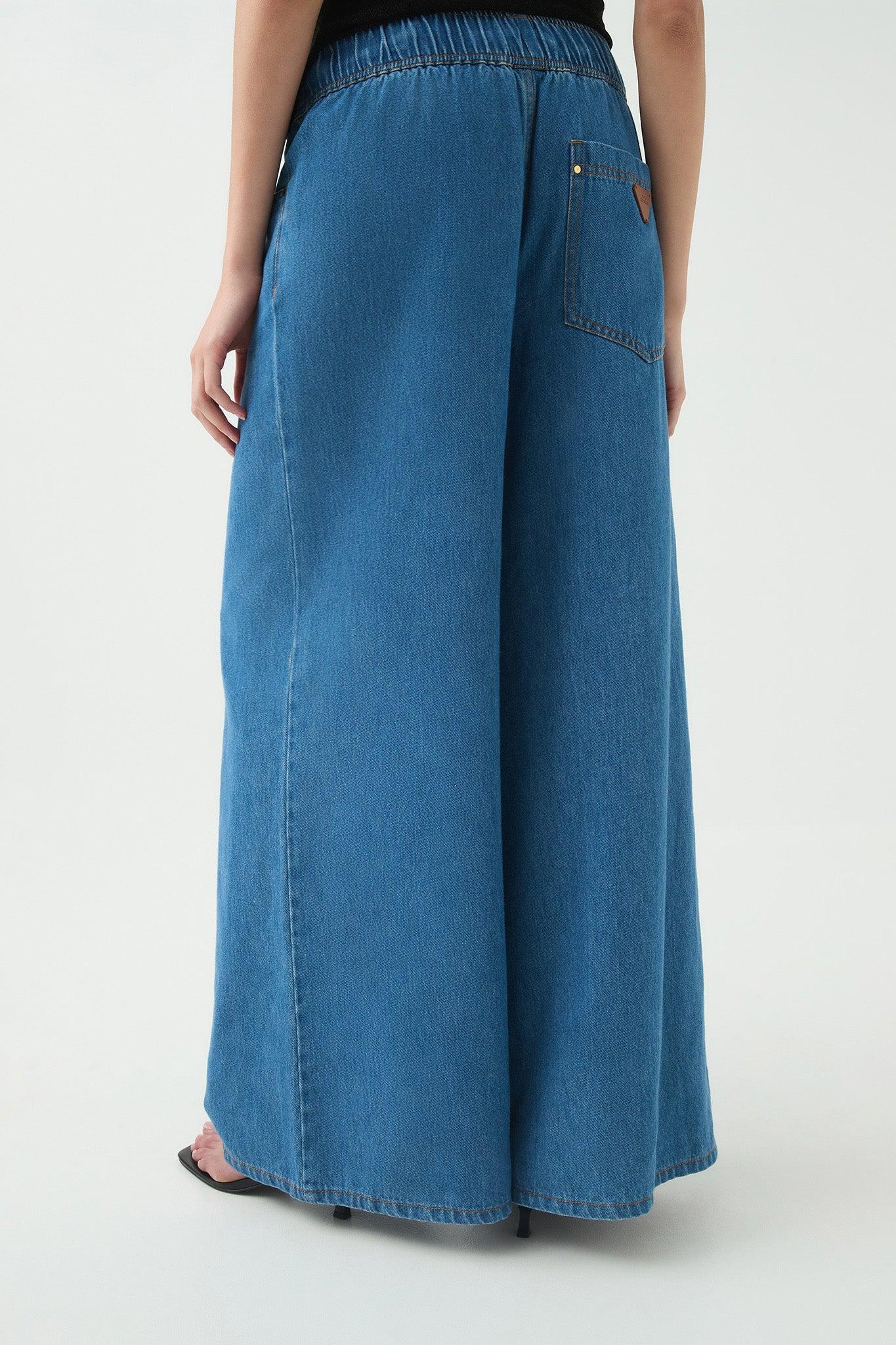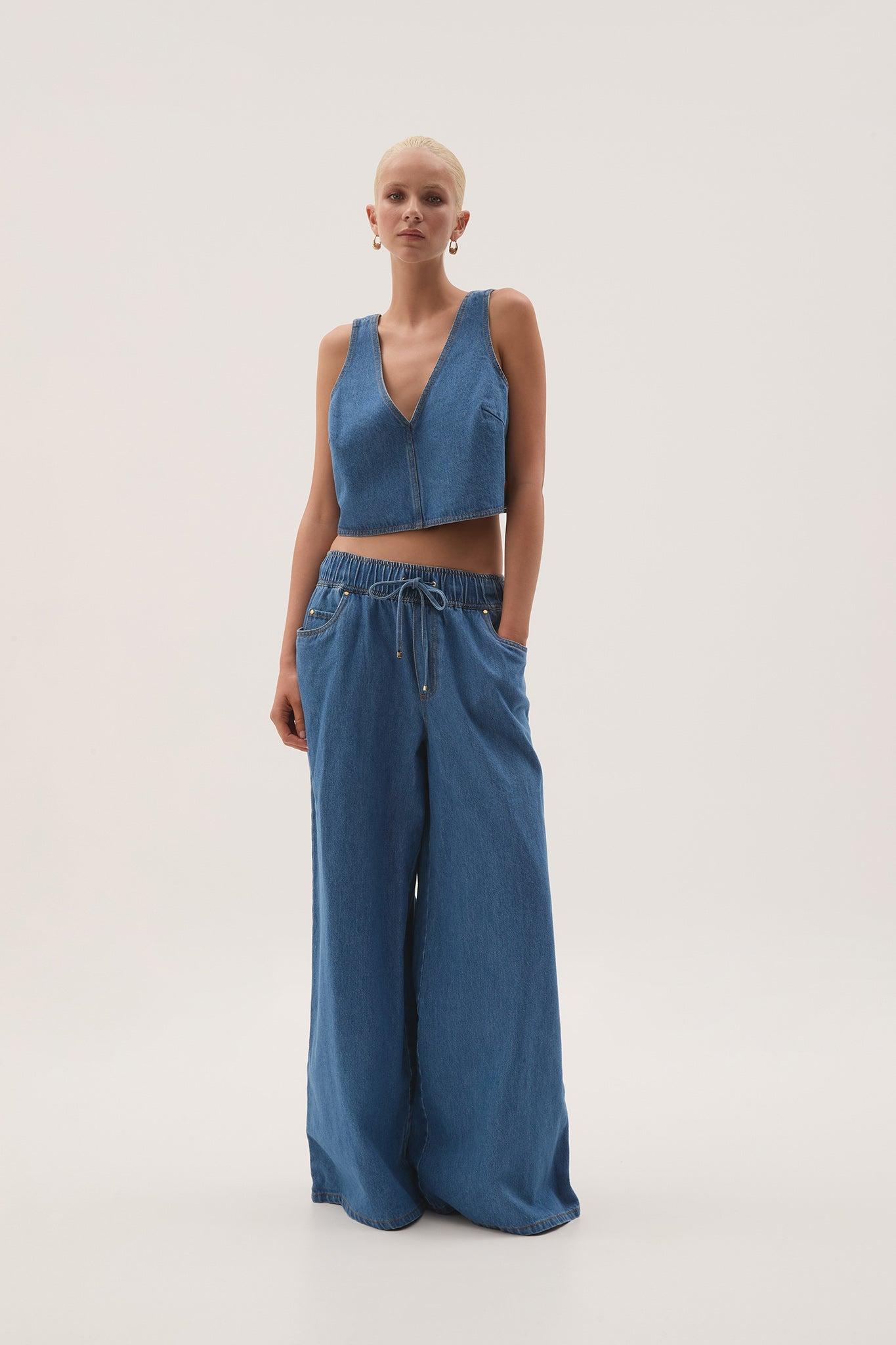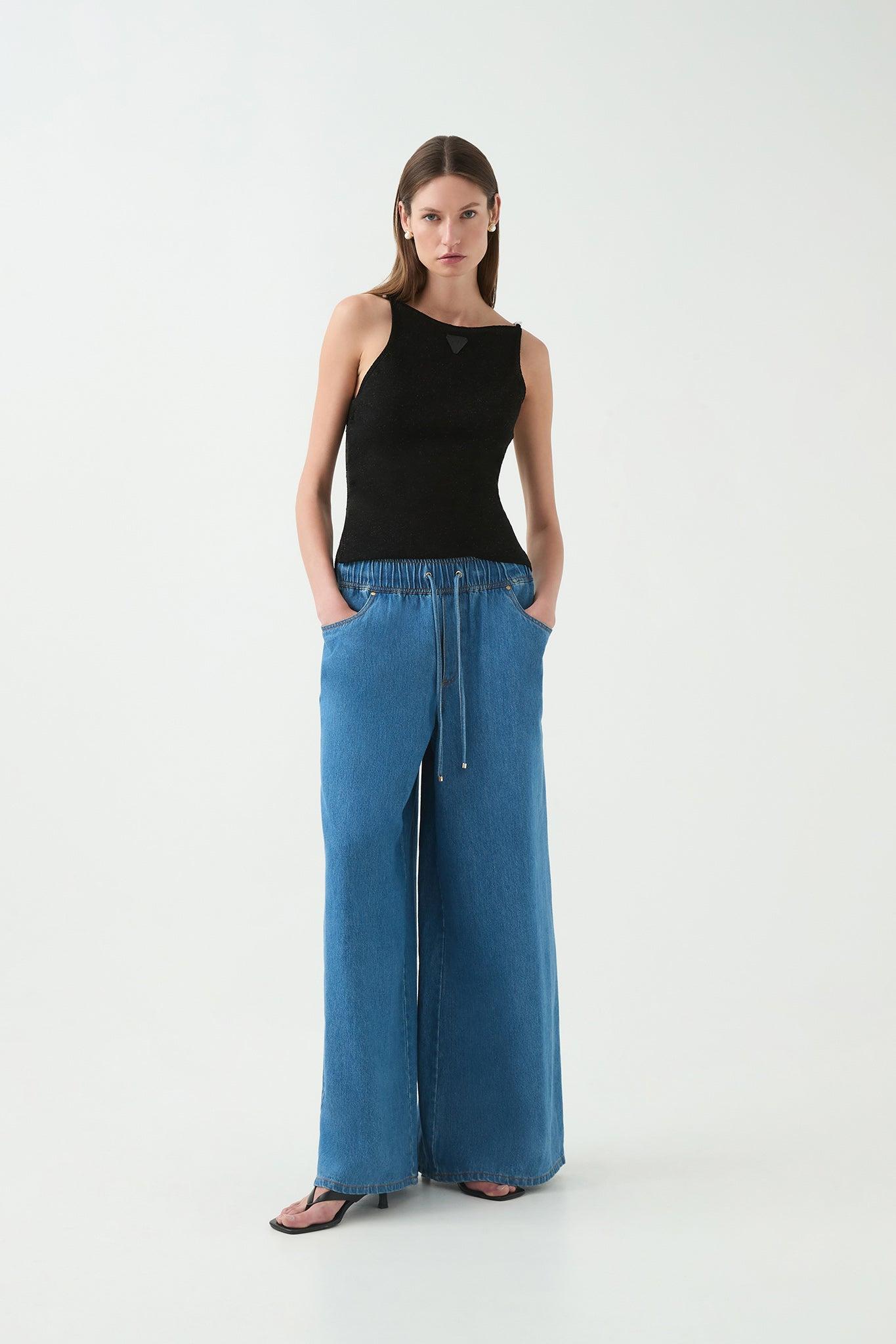 PRODUCT DETAILS Aje Studio Sunray Denim Jeans Women's wide leg jeans Wide elastic waistband for flexibility Pull gold tipped drawcords Lightweight denim Front and back pockets with gold rivet accents Embossed vegan leather logo patch at back Slip on style 100% Cotton Delicate cold machine wash Shop All Pants SIZE AND FIT Designed with a generous fit. We recommend sizing down. Joanna wears a size AU 8/S and is 170cm/5'7"