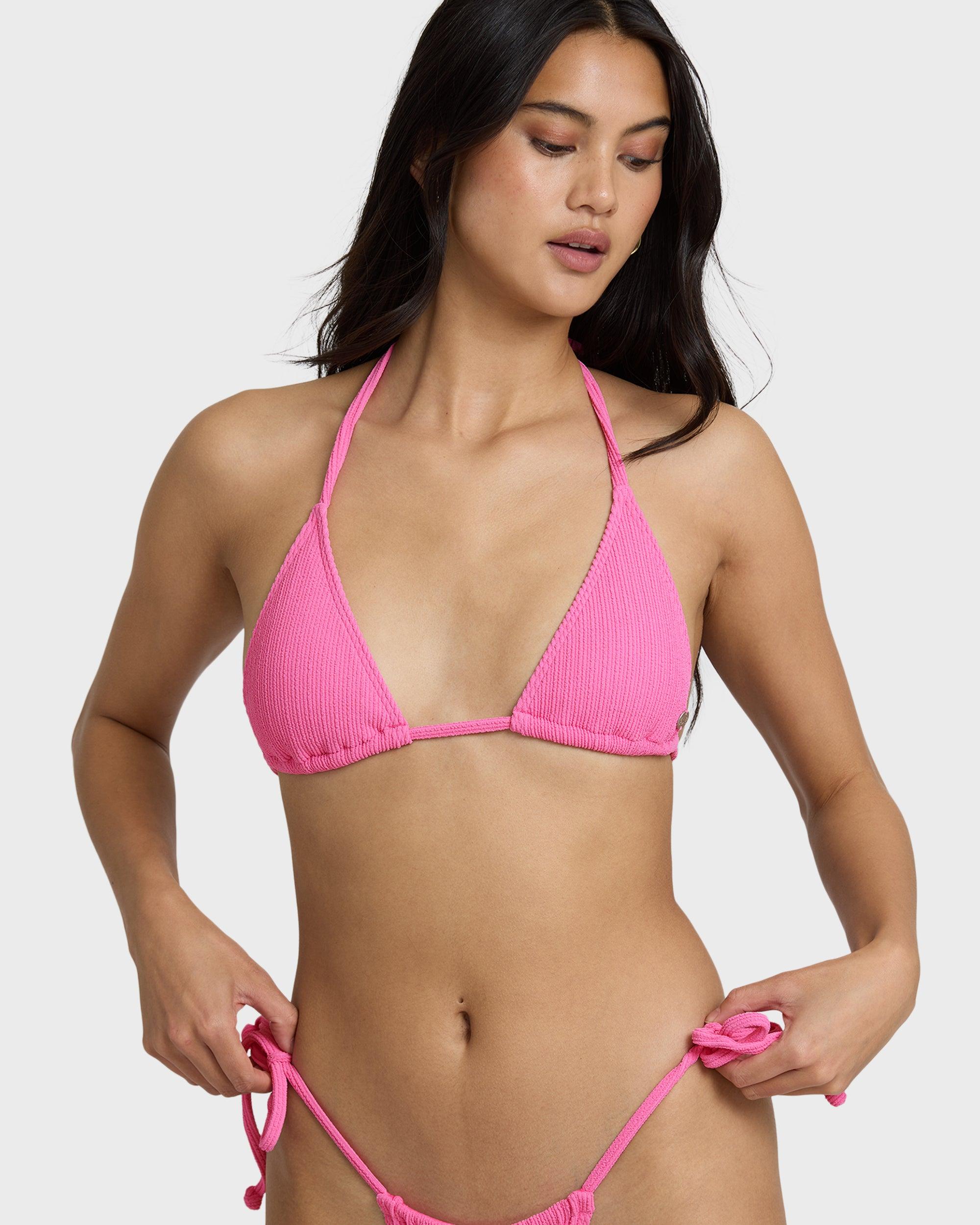 Our Sunrays Remi Triangle Bikini Top offers medium coverage with neck and back ties for your perfect fit. The partially recycled fabric blend moves with you, while removable cups let you customize your look. A subtle metal accent adds just the right touch of beachy style. Features Fabric: 83% recycled polyamide 17% elastane Type: Remi tri Fit: Medium bust coverage Features: Ties at neck and center back for adjustability Removable cups Circle metal plate at wearers left side seam