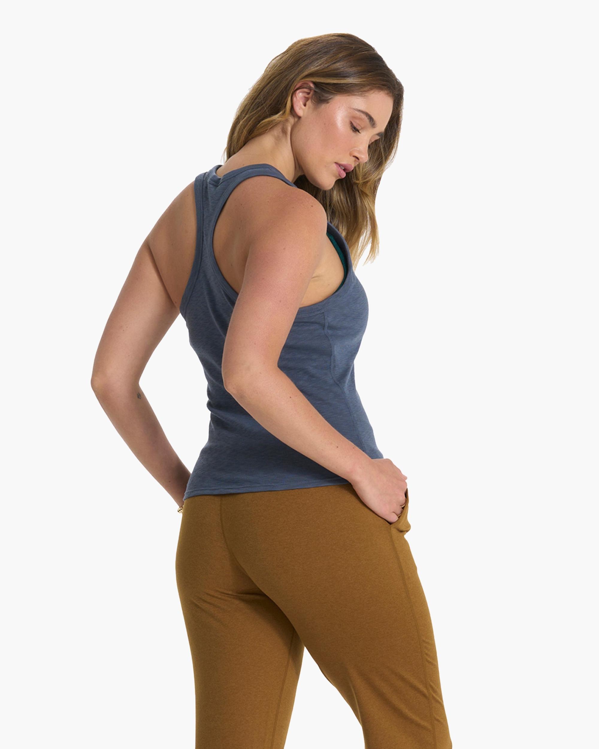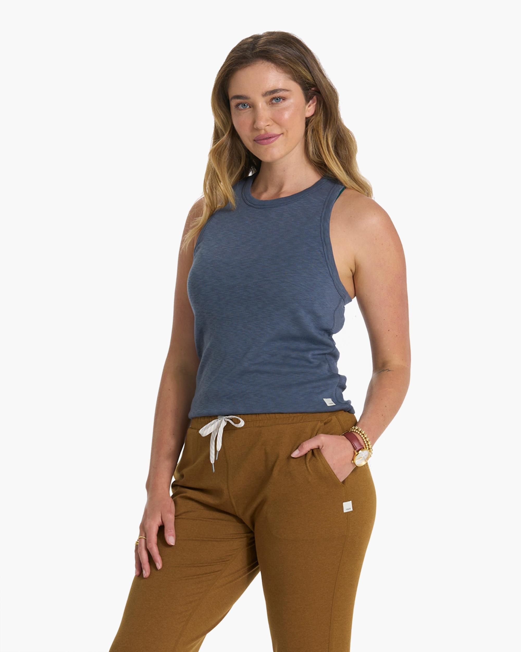 Designed with performance in mind, the Sunrise High Neck Tank features Vuori's moisture wicking stretch rib knit. Shop this women's Azure tank top.