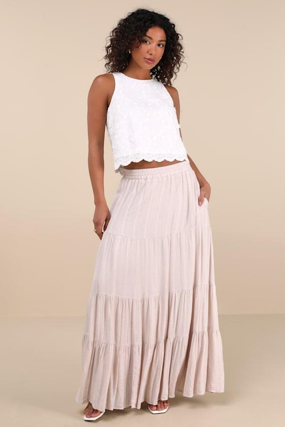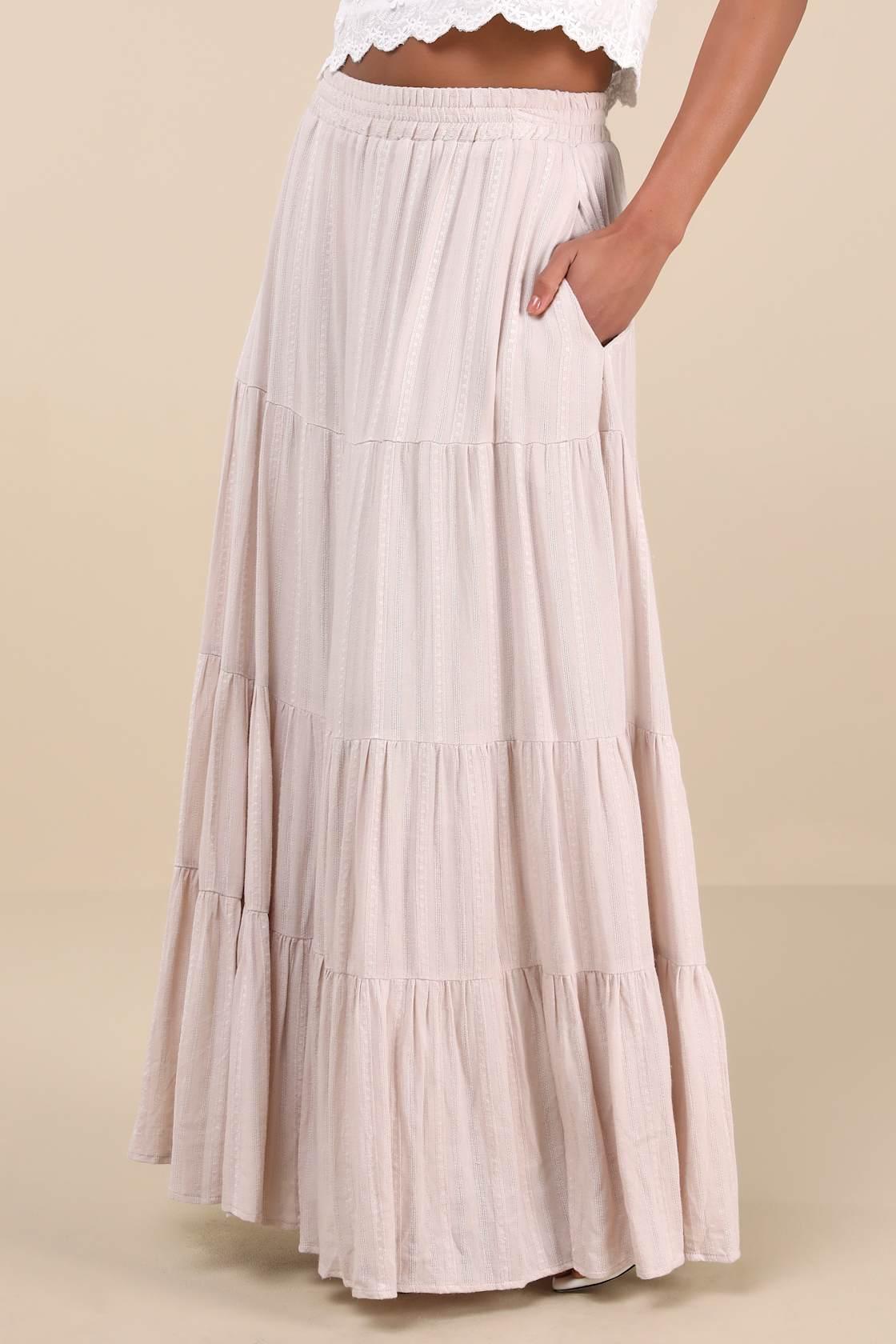 Dress it up or dress it down, the Lulus Sunset by the Sea Light Beige Embroidered Tiered Maxi Skirt is perfect for any occasion! Lightweight, woven fabric with embroidered stripes shapes this swingy skirt, featuring a high elastic waist and a tiered silhouette that ends at a maxi hem. Side seam pockets are perfect for stashing those essentials!
