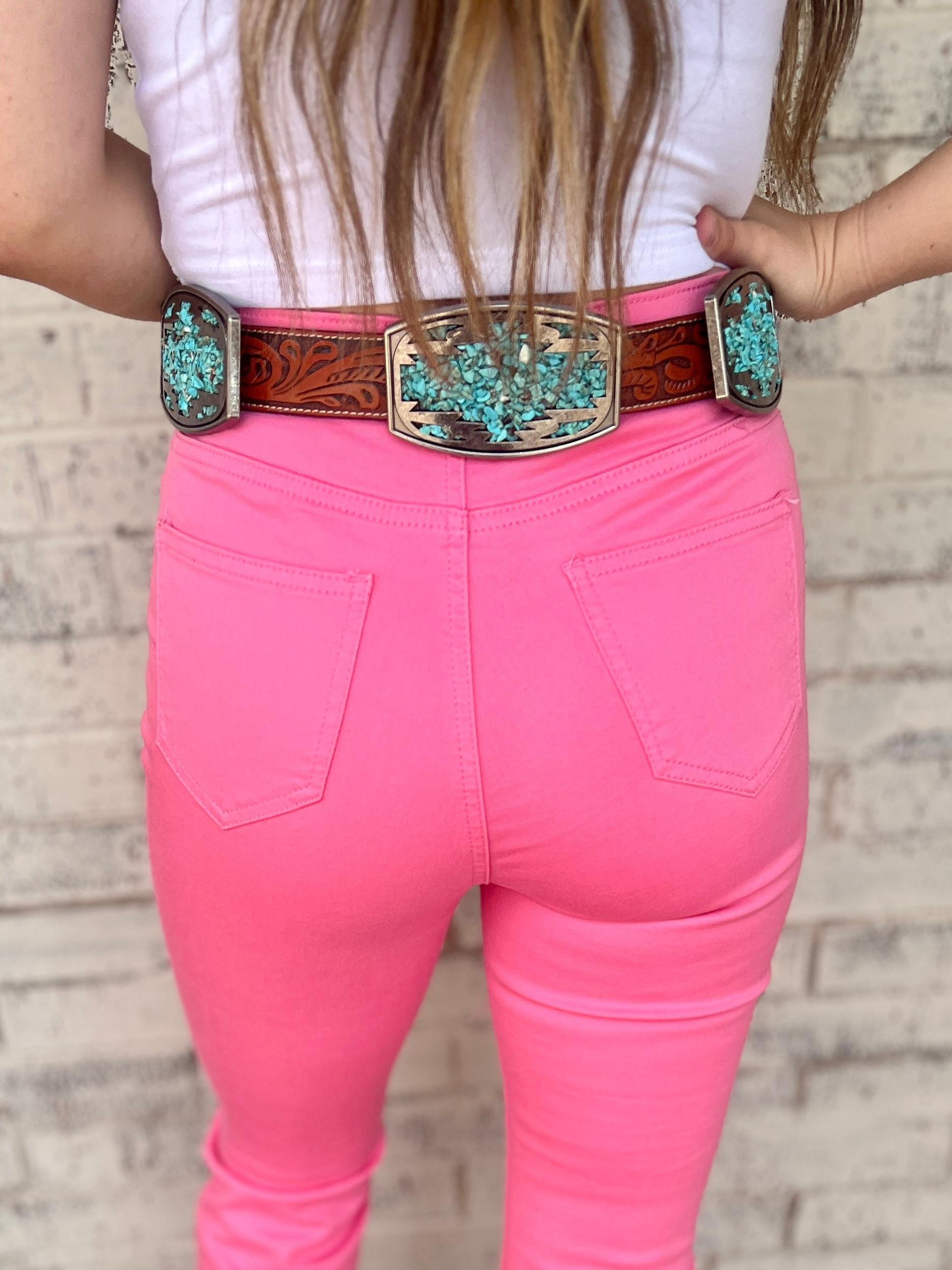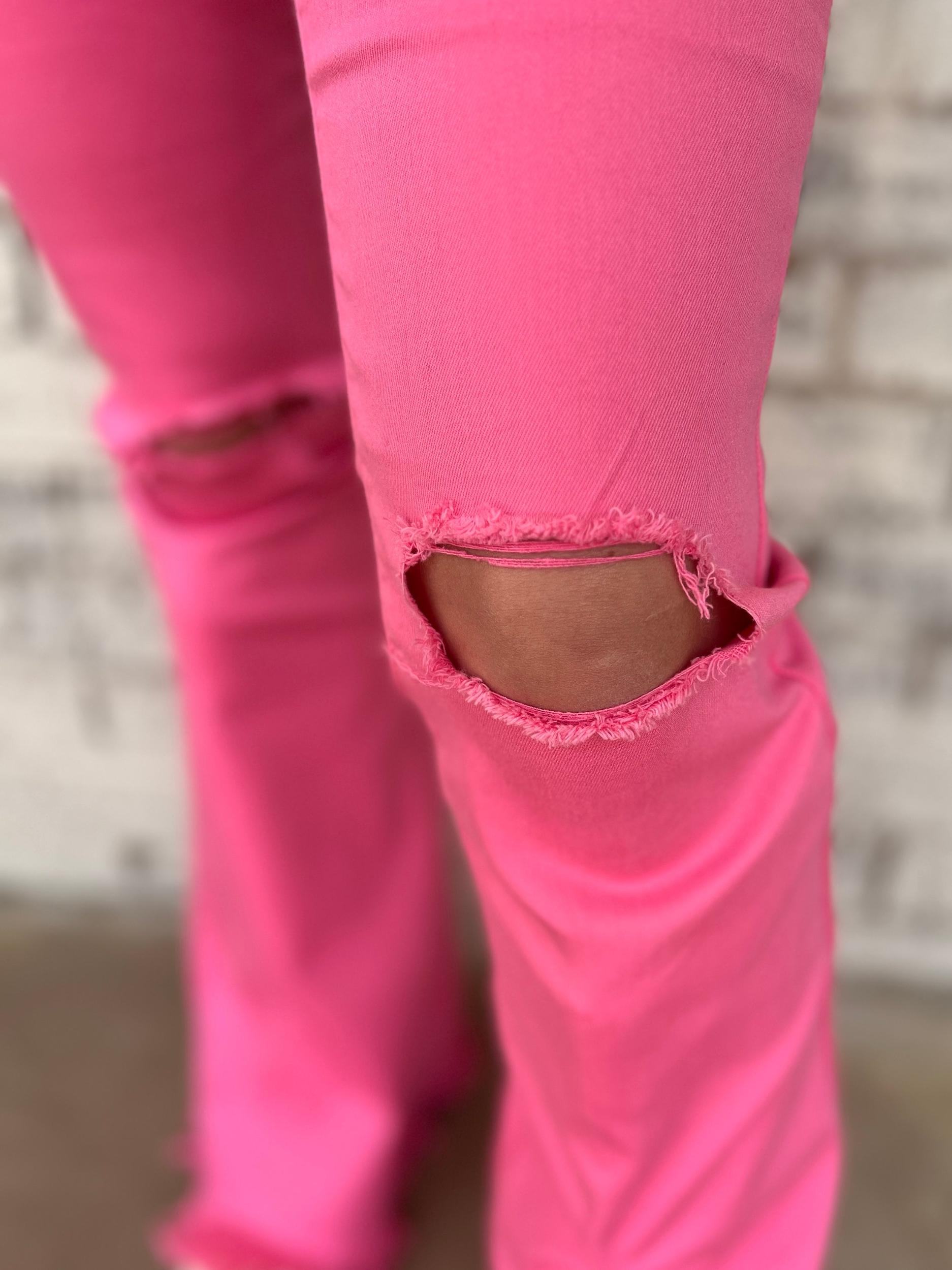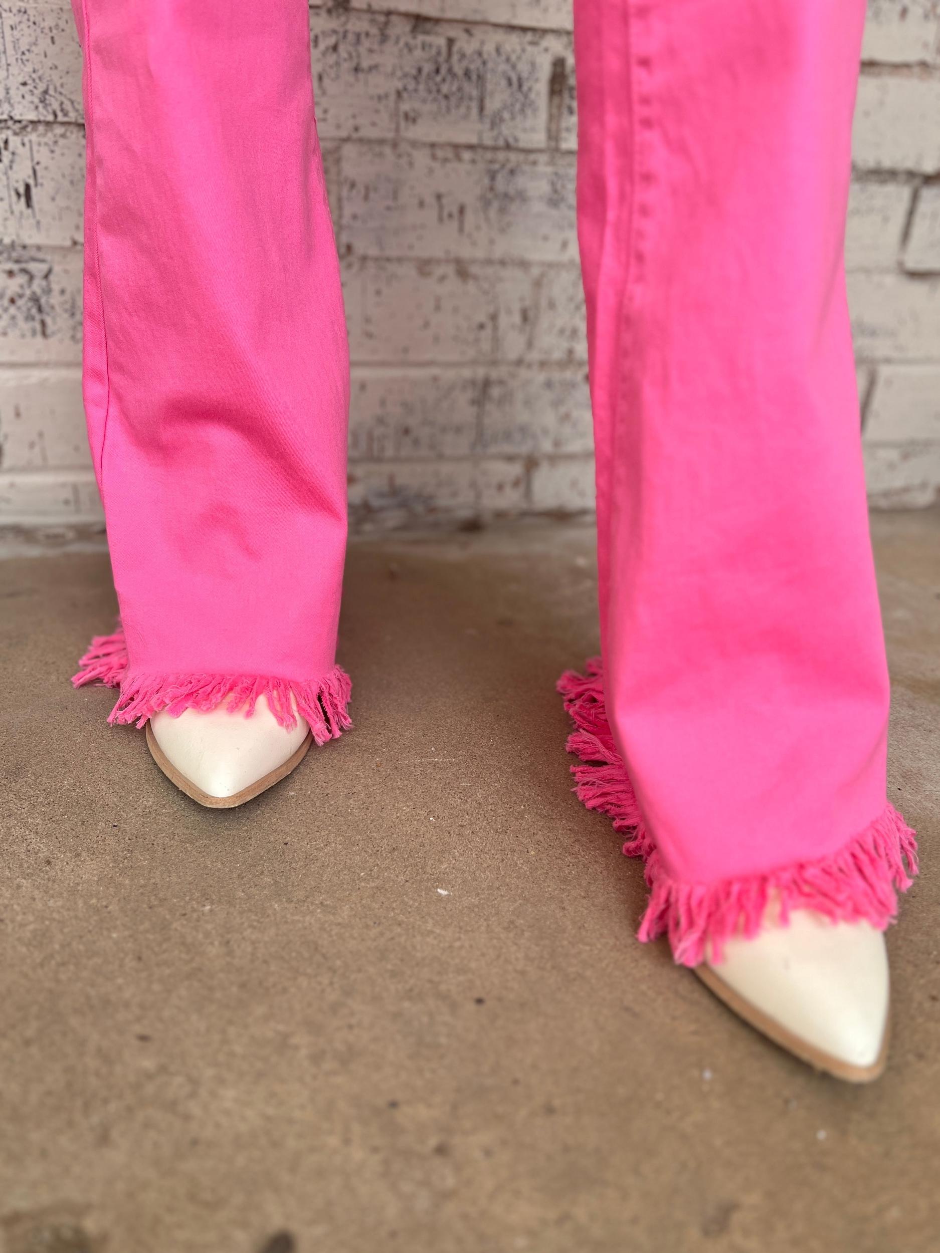 JCJQ Sunset Fringe Flares| Gussied Up Online High waisted pink jeans with holes at the knee and fringe at the hem of the flare. High waisted pink jeans with holes at the knee and fringe at the hem of the flare. 97% Cotton, 3% Spandex inseam: 32" rise: 10" Sizing guide: Small 2/4, Medium 4/6, Large 8/10, X-Large 12/14