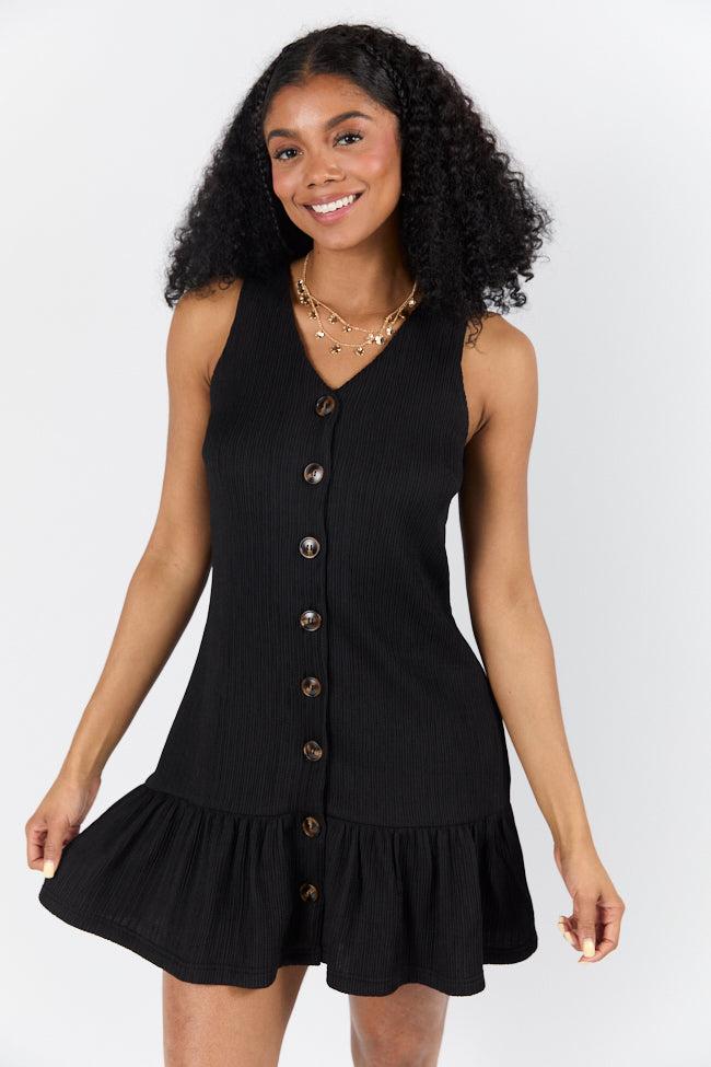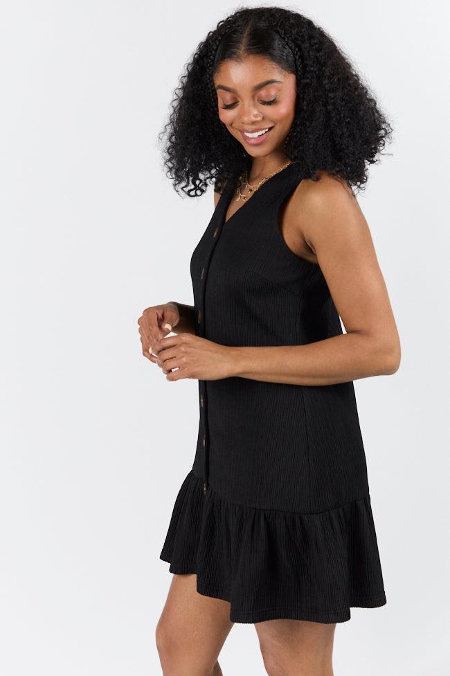 Details Knit Button Front Mini Dress Fabric has stretch V-neckline, sleeveless, functional button closure Lined Size small from shoulder to hem: 33" Material and Care 98% polyester 2% spandex Hand wash cold, no drum drying Patterns may vary Materials may have natural variations Colors may vary from different viewing devices.