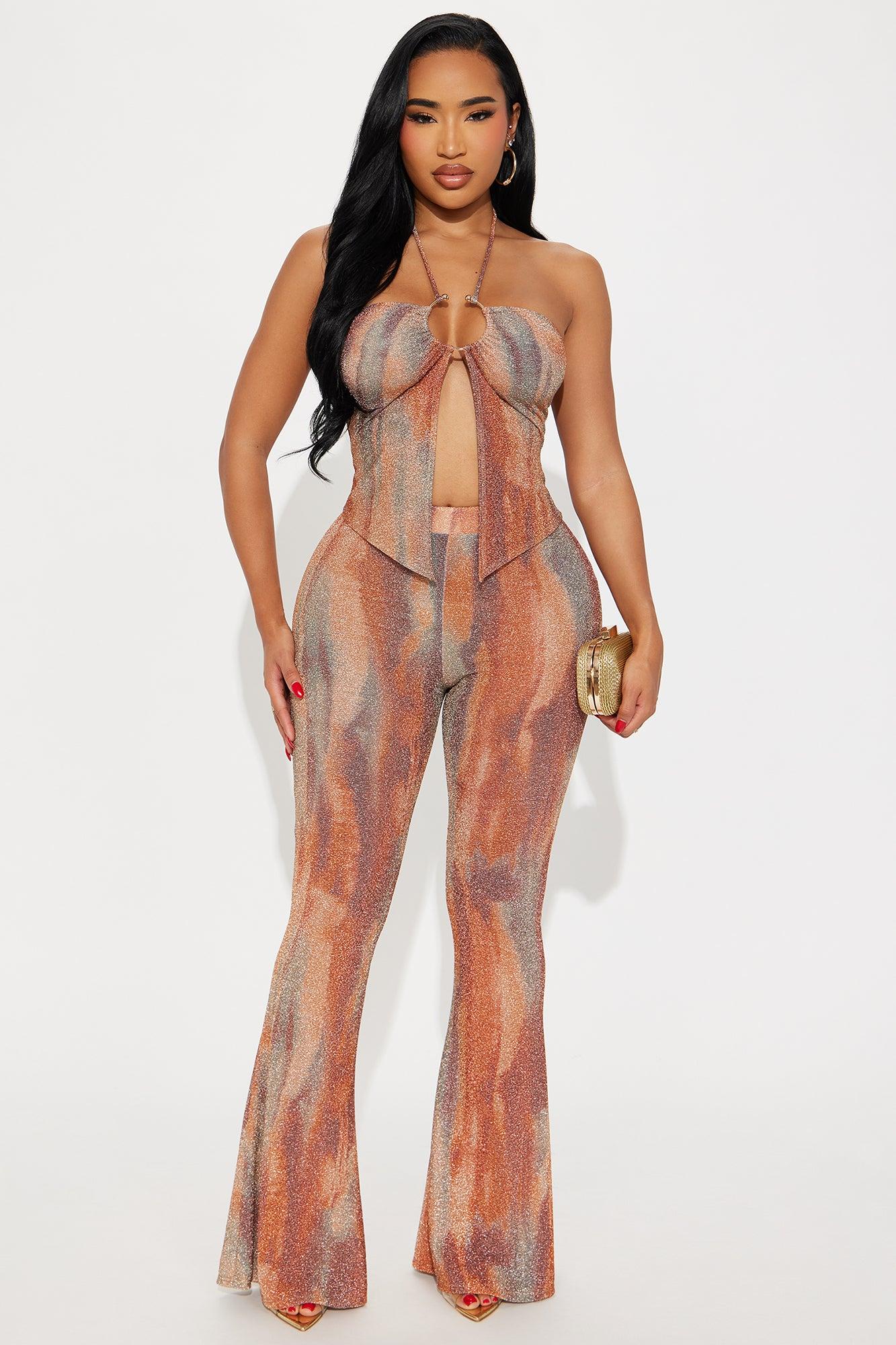Available In Orange/combo. 2 Piece Ensemble Stretch Elastic Waistband 33" Inseam Disclaimer: Print Placement Will Vary. Self- 65% Nylon 30% Metallic 5% Spandex Imported California Proposition 65WARNING: Cancer and Reproductive Harm - www.P65Warnings.ca.gov.