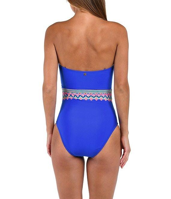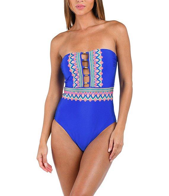 From Sunshine '79, this one piece swimsuit features: Bandeau silhouette Engineered border print with pink sequins Straight neckline Molded cups Removable adjustable straps Shirred bodice Beaded strap detail Tummy control High back Moderate coverage Fully lined Pull-on construction Nylon/lycra xtra life elastane Hand wash Imported.