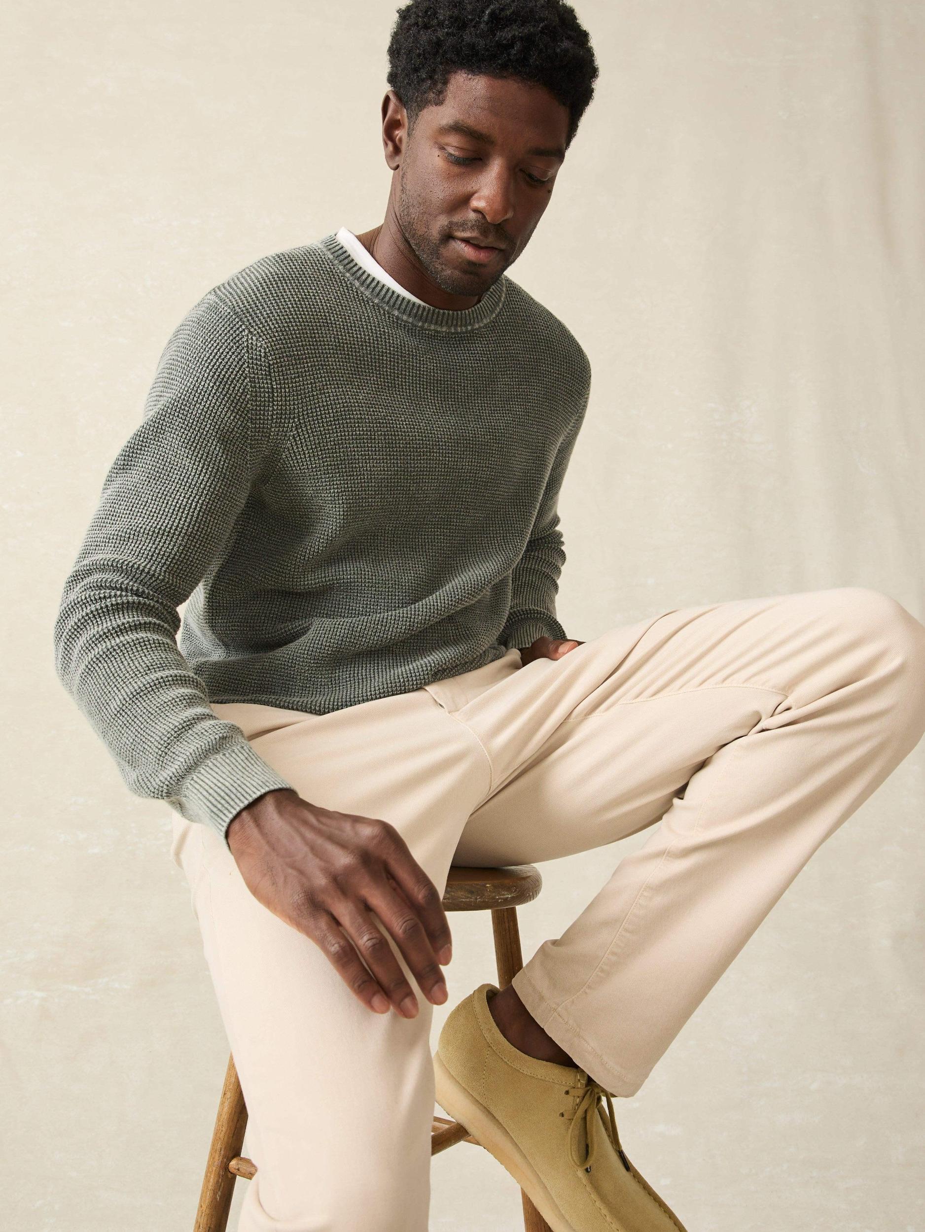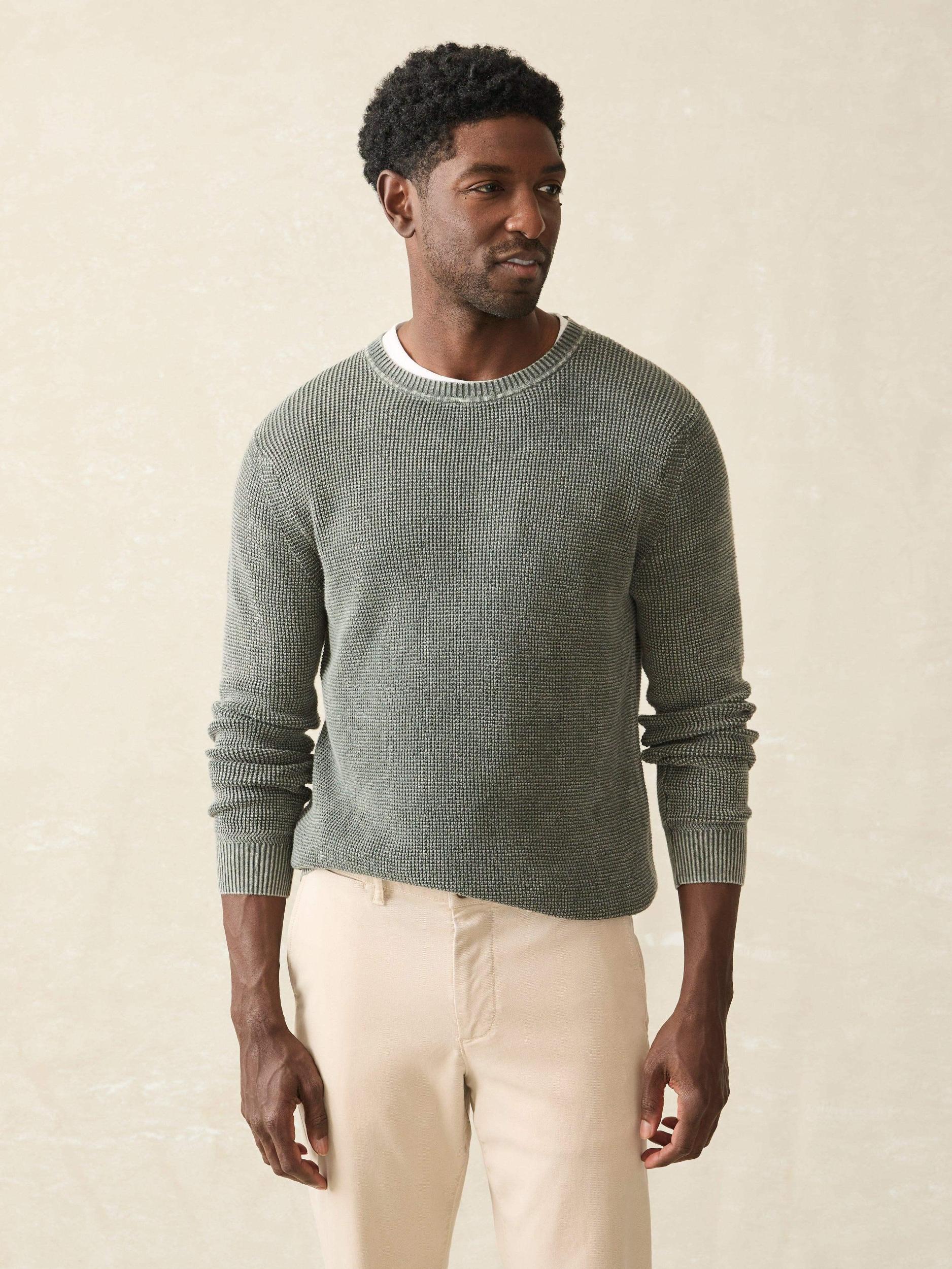 Designed as an easy to wear, transitional sweater., this will be your go-to year-round crew. Our cotton yarn is super soft but not overly warm and knit in an airy, waffle stitch giving the sweater dimension and texture. It's then garment-dyed and washed for a lived in, vintage look and feel that's casually cool for any occasion. Fit: Classic crewneck shape — roomy, but not boxy. Detail: Knit rib stitch at collar, cuffs and hem. Fashioning details at neck and armholes. Material: 100% Organic Cotton Model: Yusuke is 6'1 wearing size Medium Care: Hand wash cold with like colors. Do not bleach. Lay flat to dry. Cool iron if needed. Dry cleanable. MYF2313-MOV