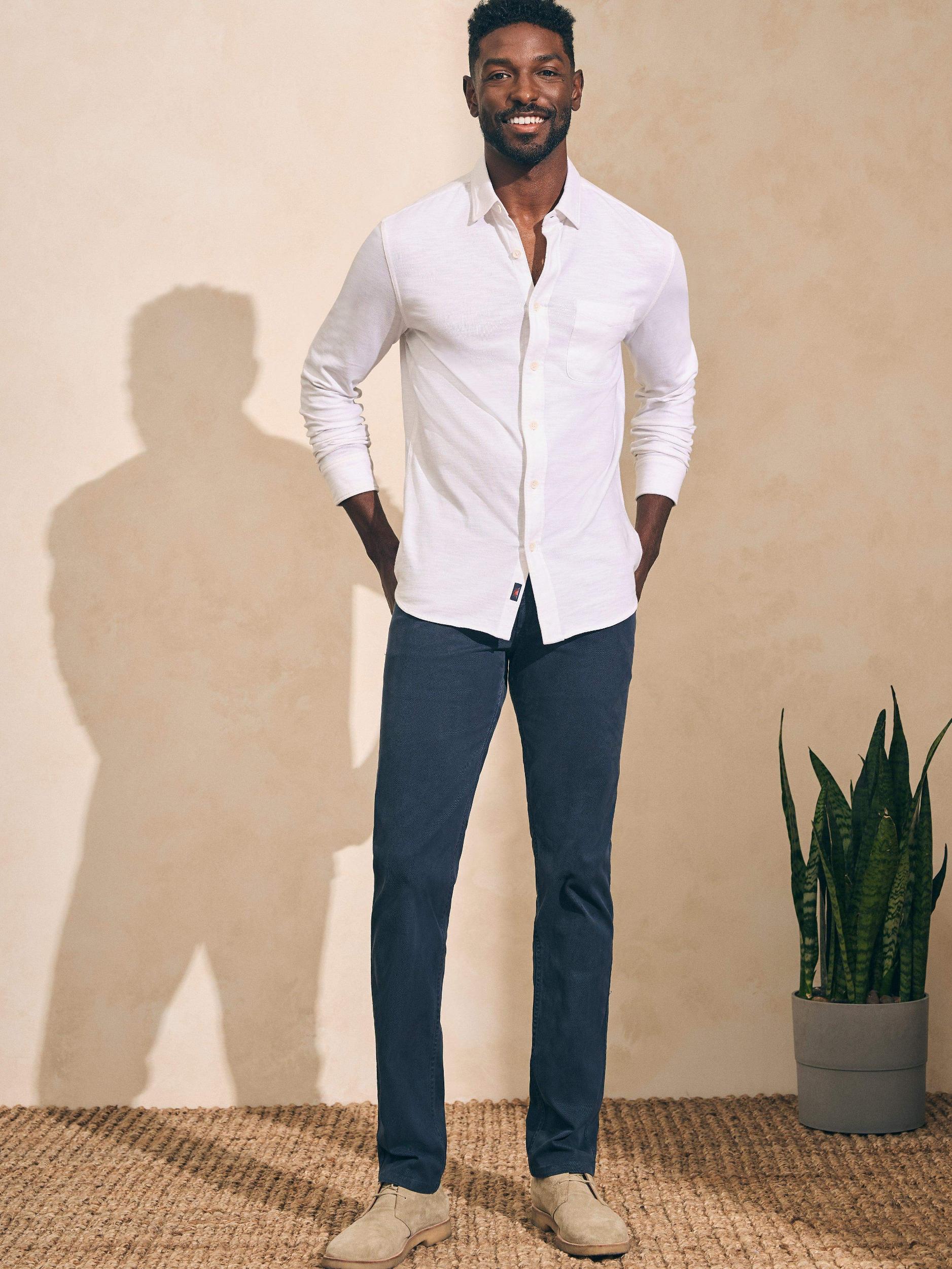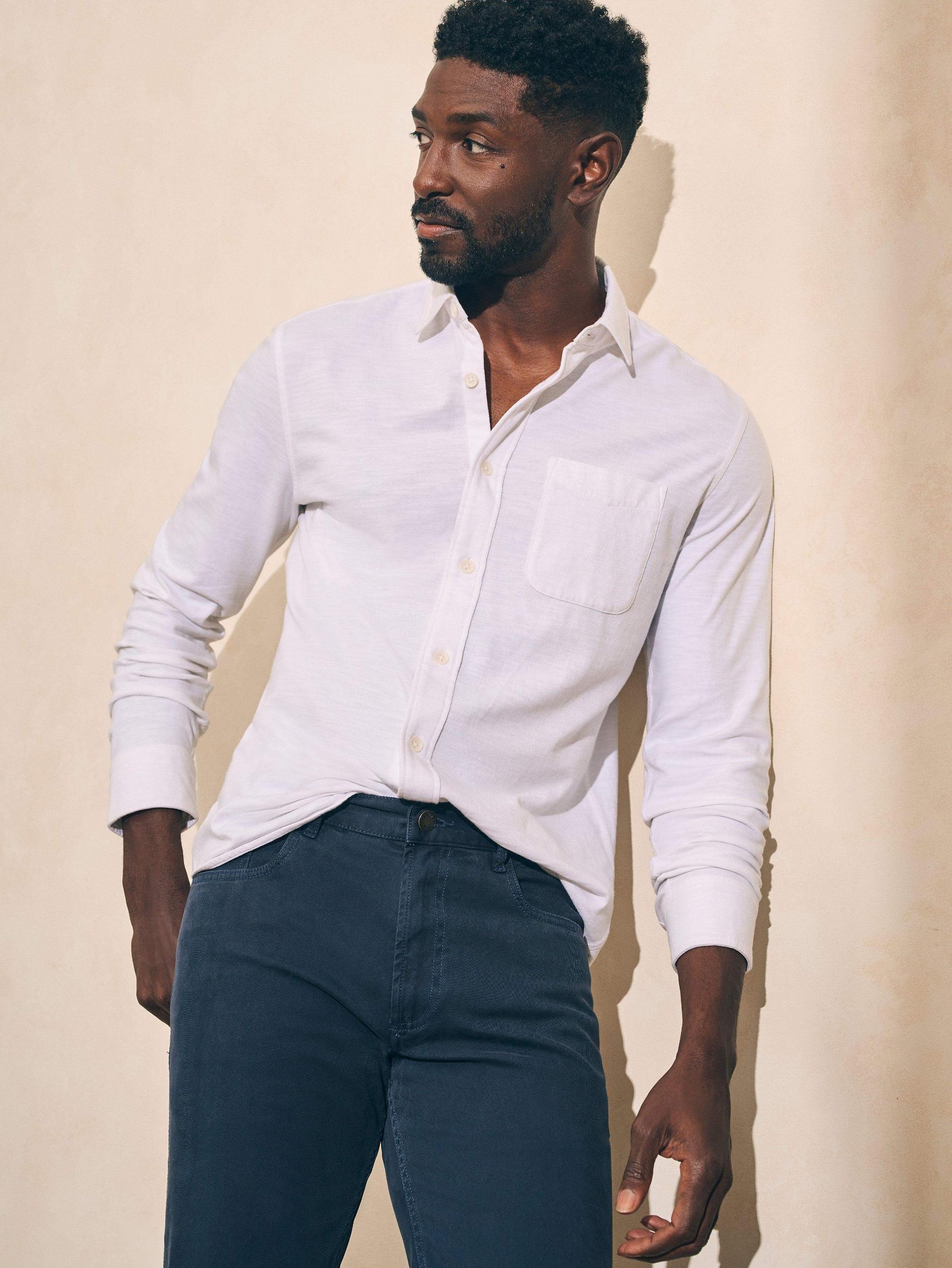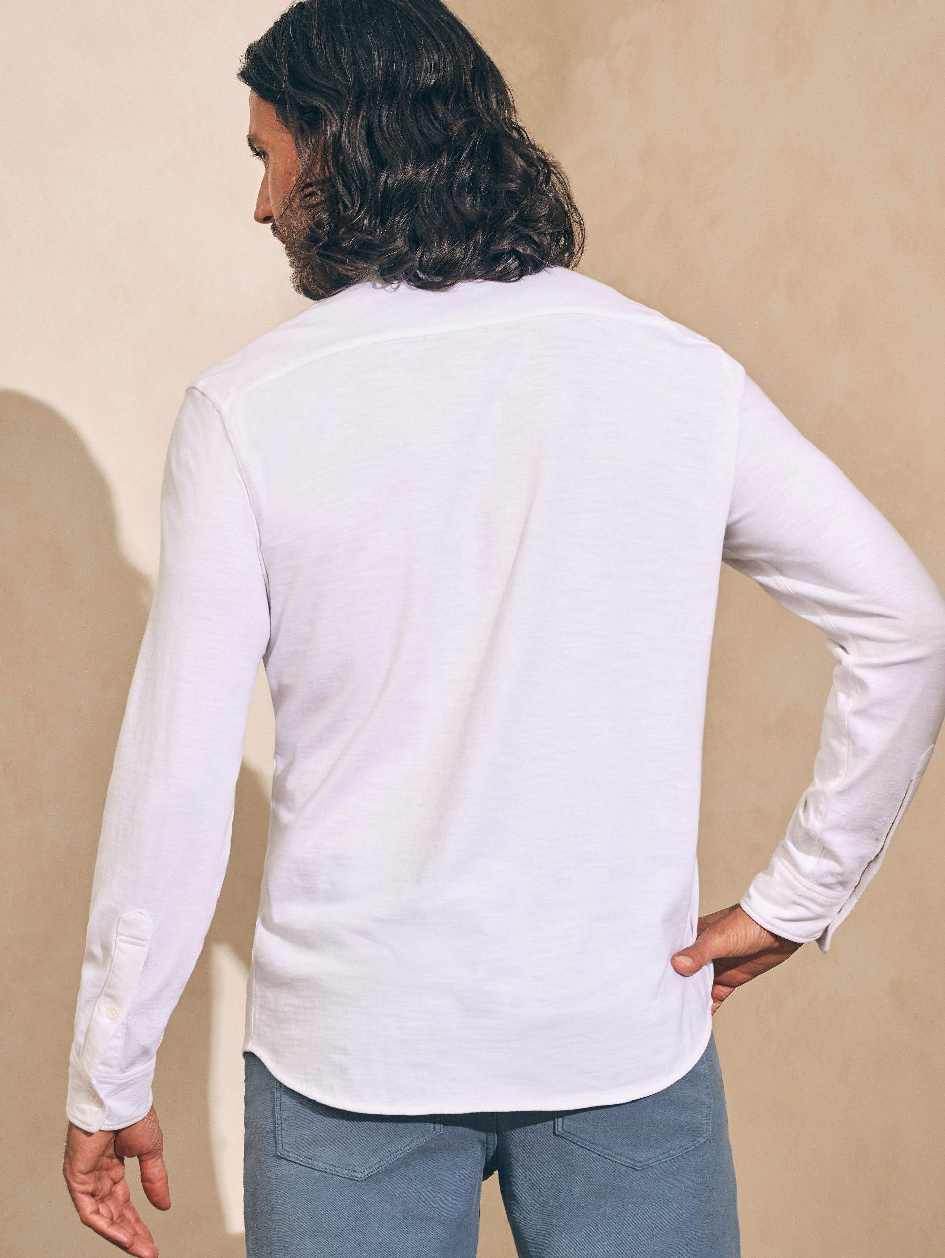 Crafted from incredibly soft 100% organic cotton and knit (rather than woven), the Knit Seasons shirt looks like a button-up with utility style details, but feels like your favorite tee. New for this season is the single pocket design that gives it a more minimal and streamlined look. Fit: Relaxed through the chest with a slight taper at the waist. Relaxed, tapered sleeves Detail: Spread collar. Button front. Long sleeves with button cuffs. Single patch pocket at the wearer's left chest. Topstitch detailing. Shirttail hem Material: 100% Organic Cotton; Faux Corozo Buttons Model: Jared is 6'1 wearing size Medium, Jamal is 6’2 wearing size Medium Care: Turn inside out. Machine wash cold with like colors. Gentle cycle. Do not bleach. Tumble dry low. Remove promptly. Cool iron when needed. Imported MXS2309-WHT