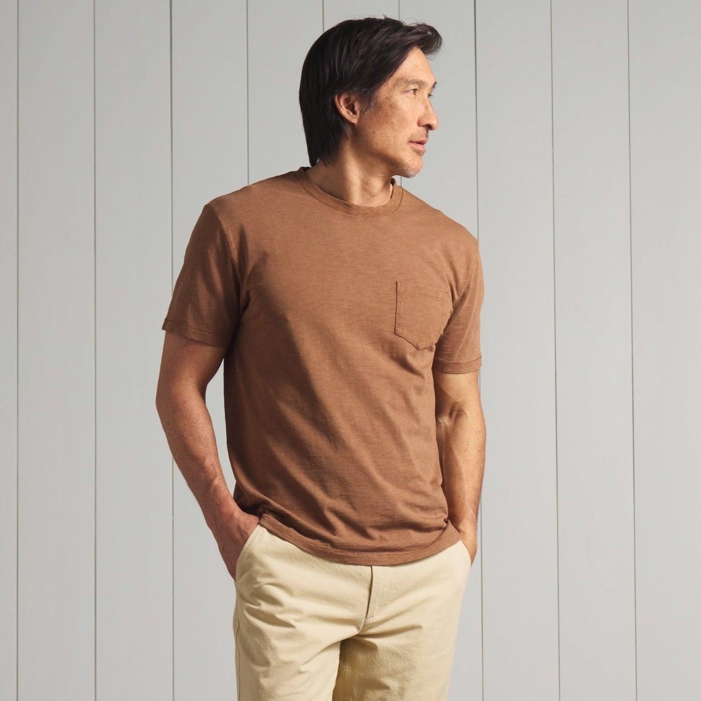 Introducing our lightest in weight, all-cotton pocket tee. Crafted with fine slub cotton yarn, the airy light weight jersey fabric is cut, sewn and garment dyed into rich and saturated colors. This season we've added a special "sunwash" to make it feel like its been your favorite of many in your closet. Naturally breathable with an ultra soft finish. The perfect summer tee. The Model is also wearing: Mercer Duck Canvas Officer Pants - Biscotti. Model: Adrian is wearing size medium and is 6'. ----Details---- Garment dyed + Snow wash Slub Jersey Tee 1x1 rib collar Imported ----Materials---- 100% Cotton ----Size & Fit---- Measuring Method: All measurements are in inches and based on a “flat” garment, as shown below. For comparison with one of your existing garments, please lay garment on a flat surface and follow the key measurement points. For chest and neck, if you double the flat measurement, you will get close to the full body measurement. ----Care---- Machine Wash Cold Separately Do Not Soak Before Washing Do Not Bleach Remove Promptly Tumble Dry Low Or Hang Dry In Shaded Area Cool Iron If Necessary