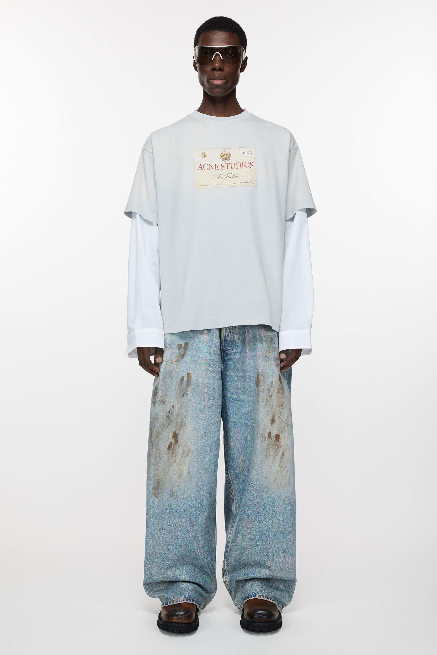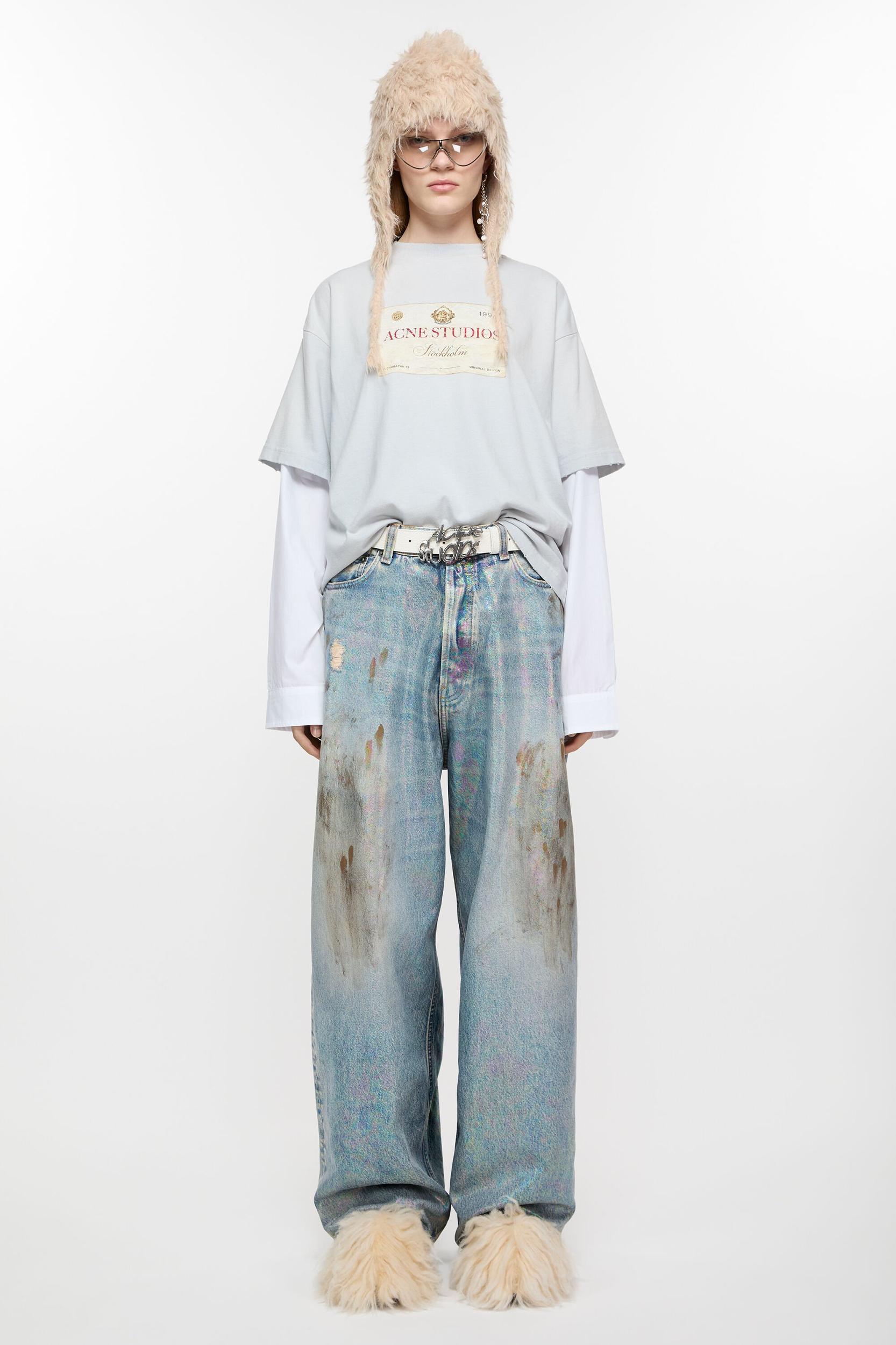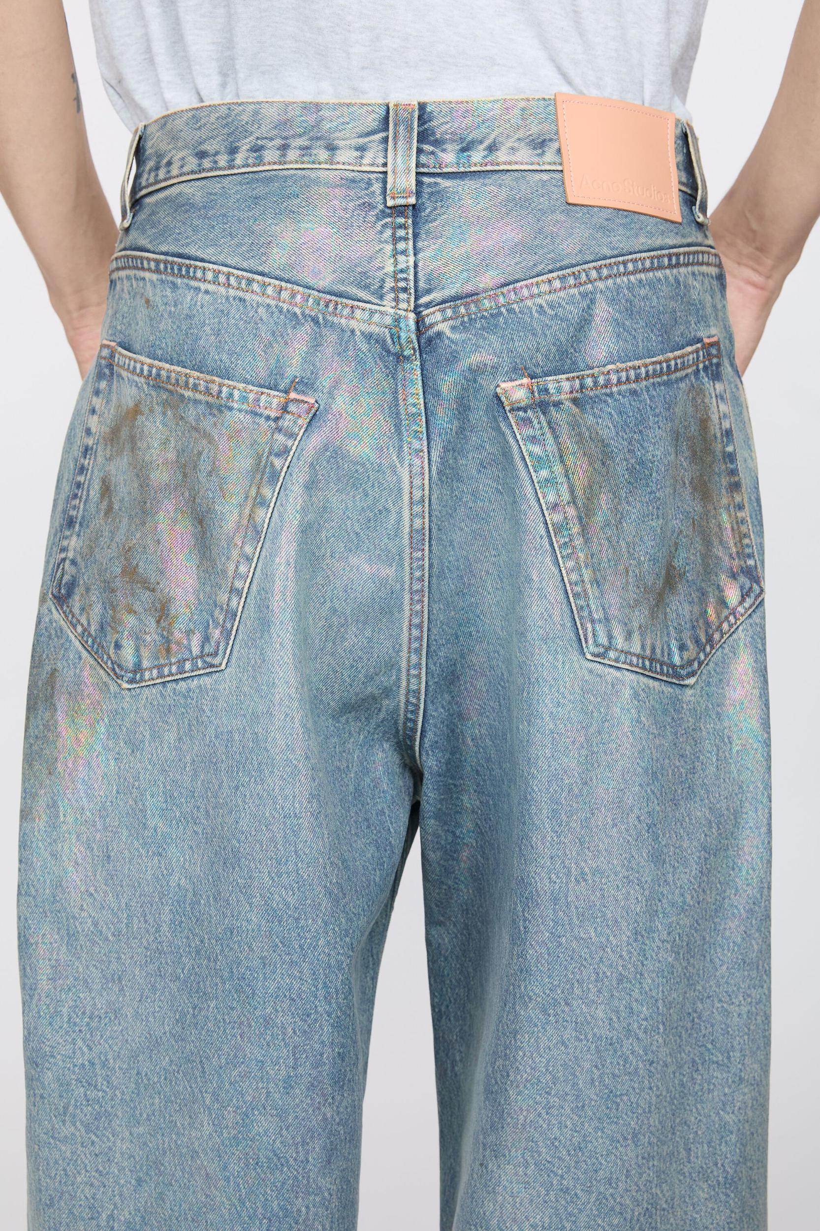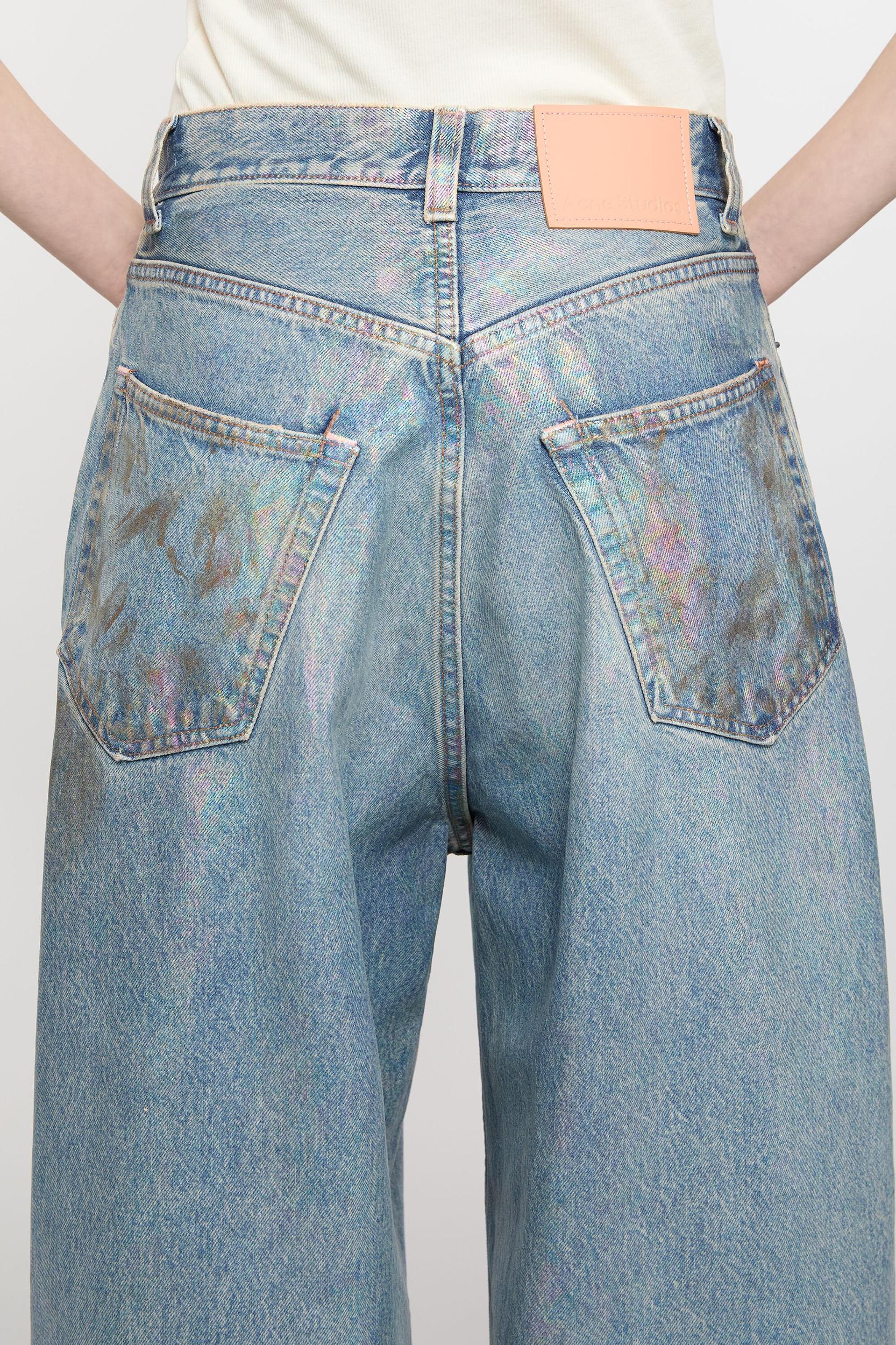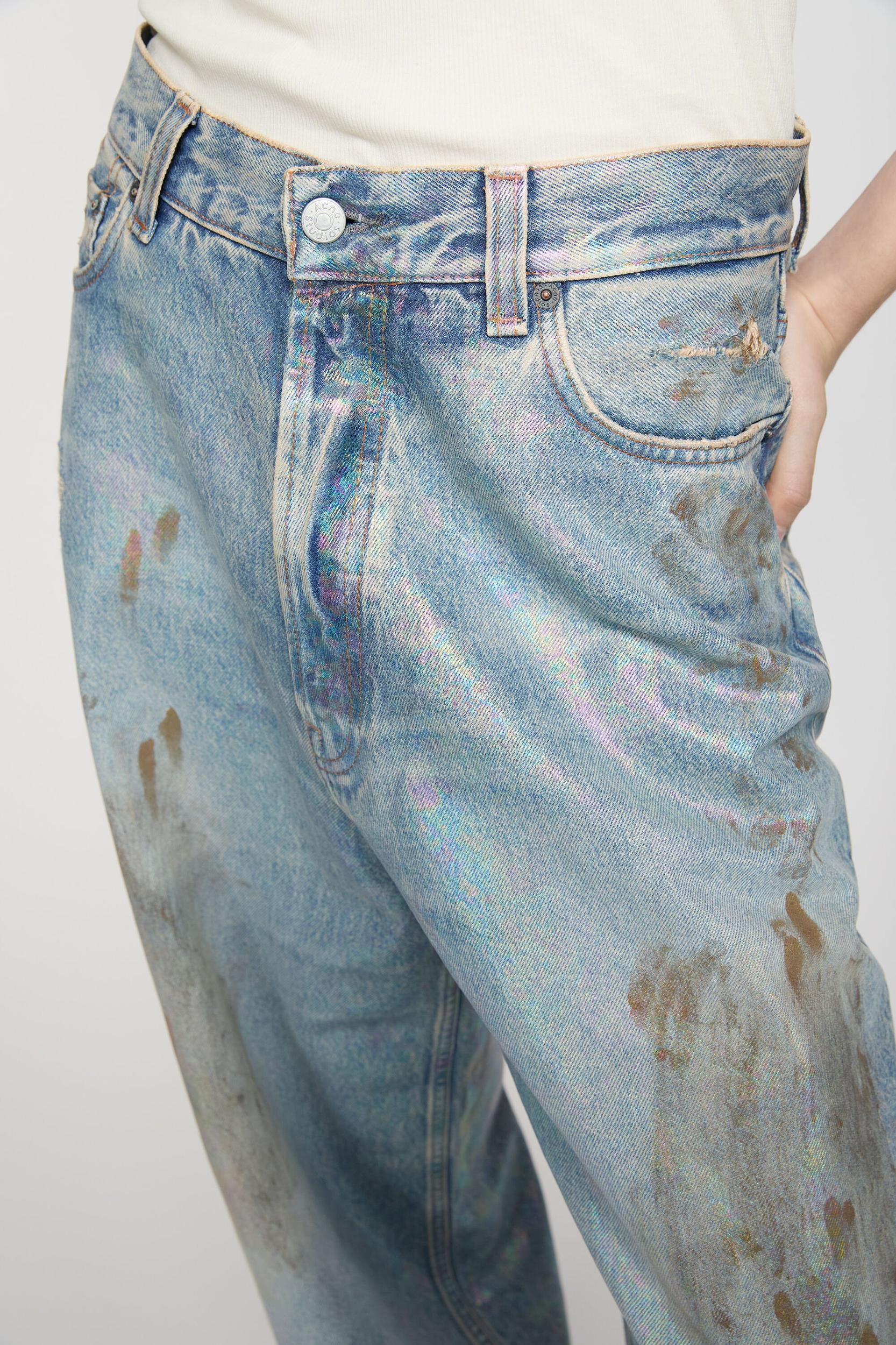 2023 jeans are cut to a super baggy fit with a mid waist, super wide leg and long length. Made of non stretch denim in a mid blue vintage wash with seasonal iridescent and coated finish Acne Studios 2023 Dirty Halo