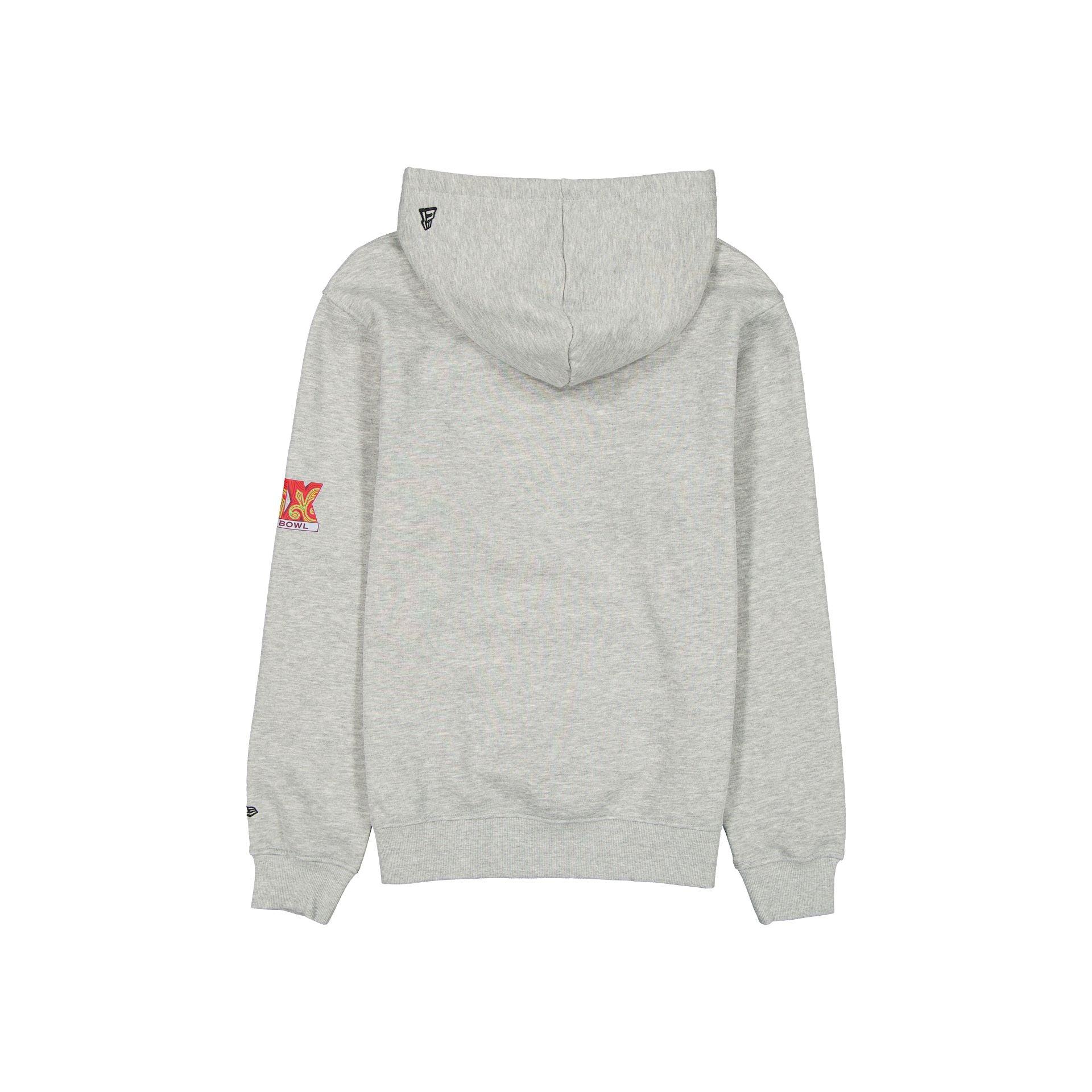 The Super Bowl LIX Gray Hoodie features a screen-printed Super Bowl LIX graphic at the front with a matching logo at the left sleeve, a kangaroo pocket, and adjustable drawstrings at the hood. Fabric: 60% Cotton, 40% Polyester