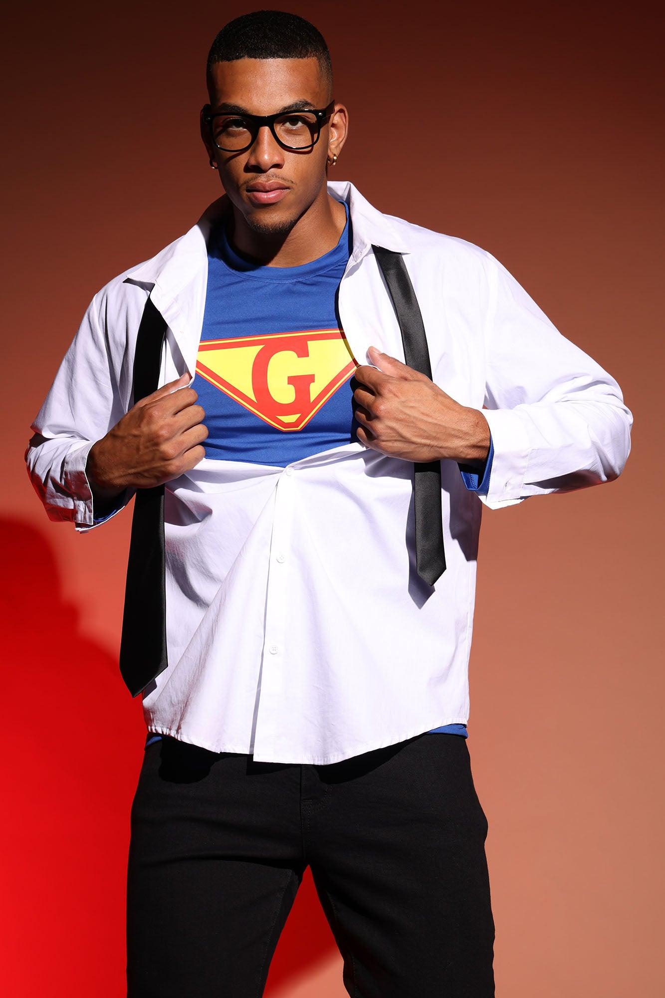 Available In Multi Color. Super Guy Hero Costume Super Guy Long Sleeve Tee Included Long Sleeve Button Down Shirt Included Necktie Included Glasses Included Final Sale T-Shirt and Tie: 100% Polyester Button Down Shirt: 100% Cotton Imported California Proposition 65 WARNING: Cancer and Reproductive Harm - www.P65Warnings.ca.gov.