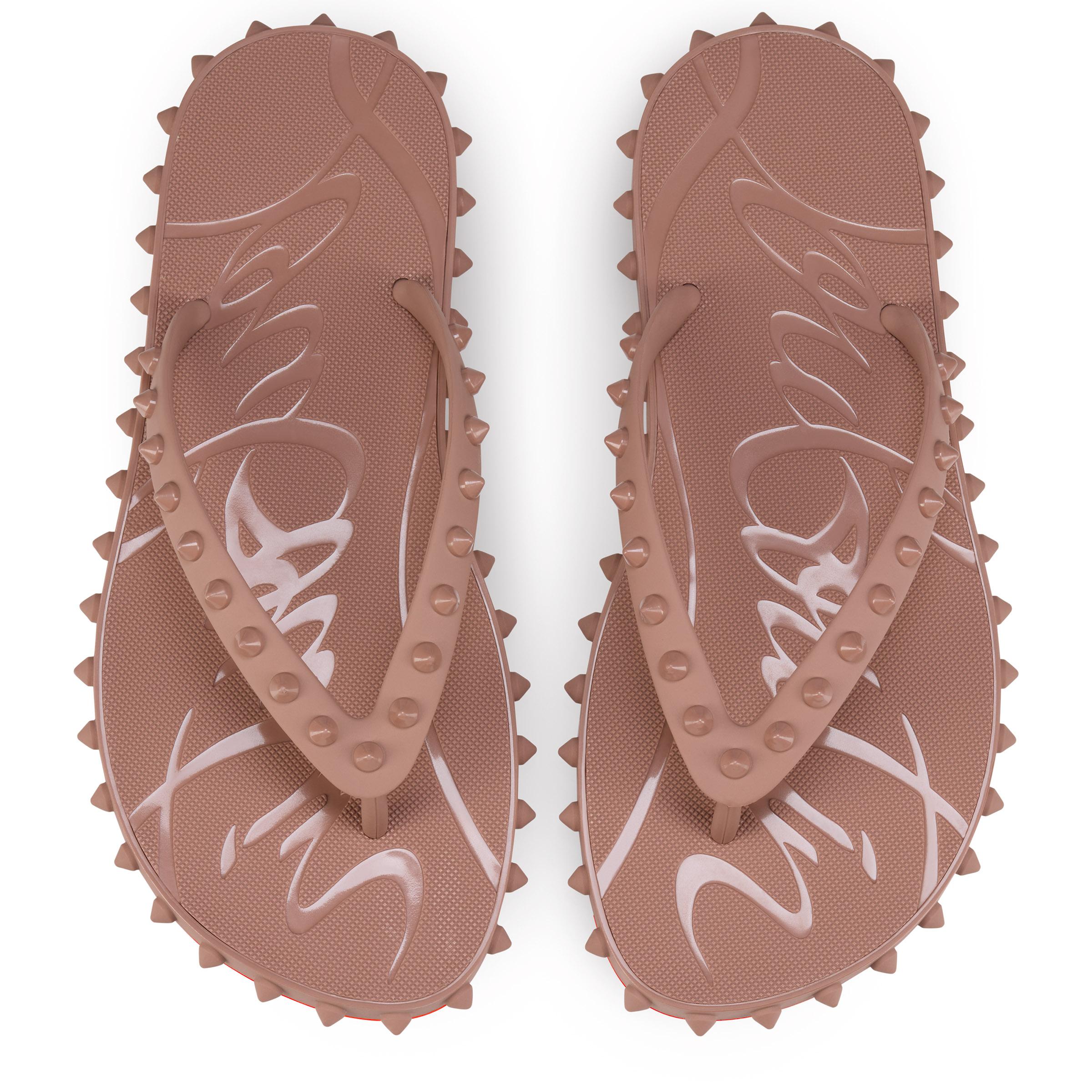 The Super Loubi Flip Donna sandal has a daring appeal with iconic Maison Christian Louboutin spikes outlining the sole and adorning the straps. The sole is Loubi red, complete with a Louboutin signature that leaves its imprint in the sand. This sleek model is crafted in Romance pink rubber, with a hint of signature Loubi red beneath.