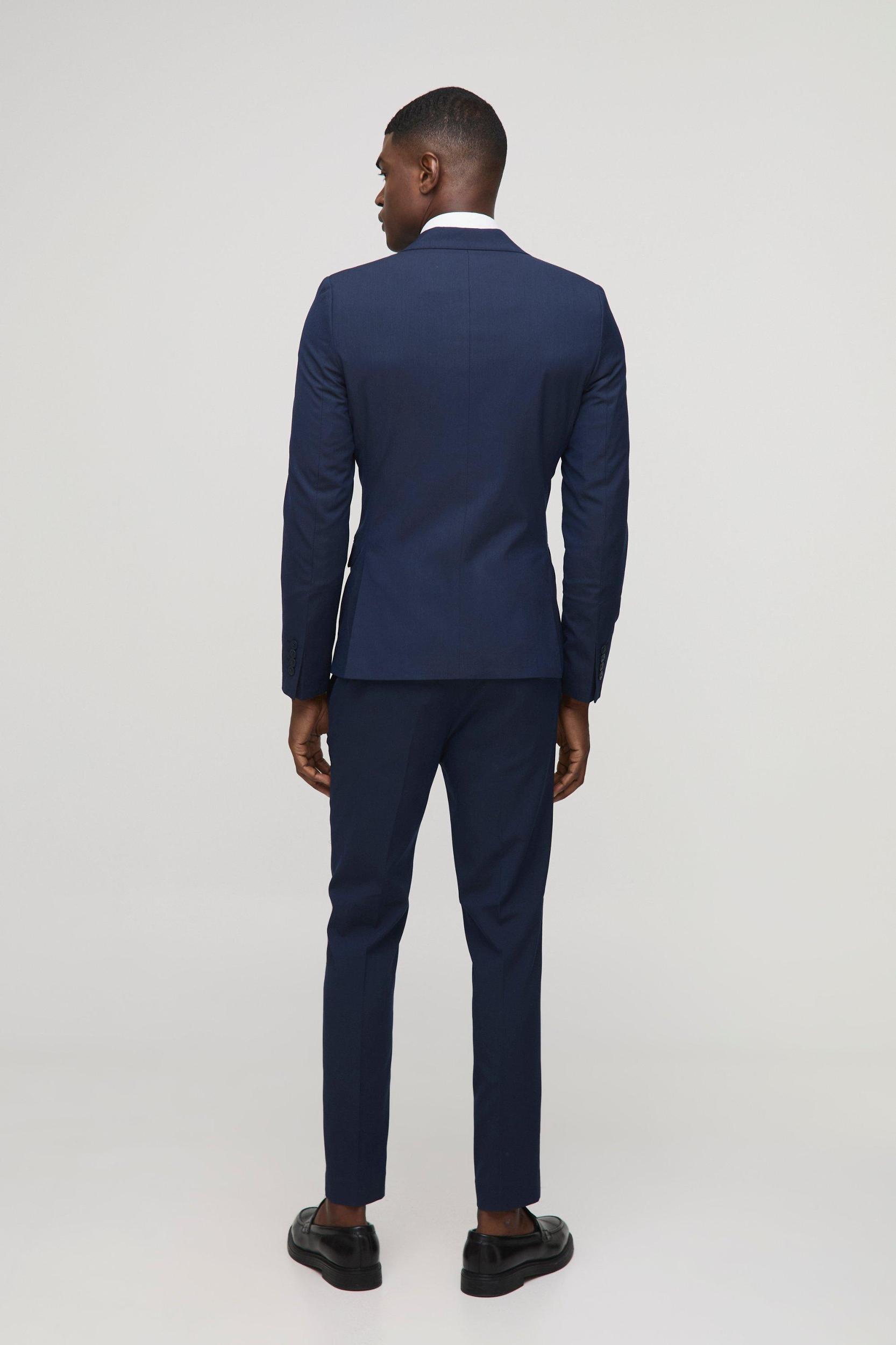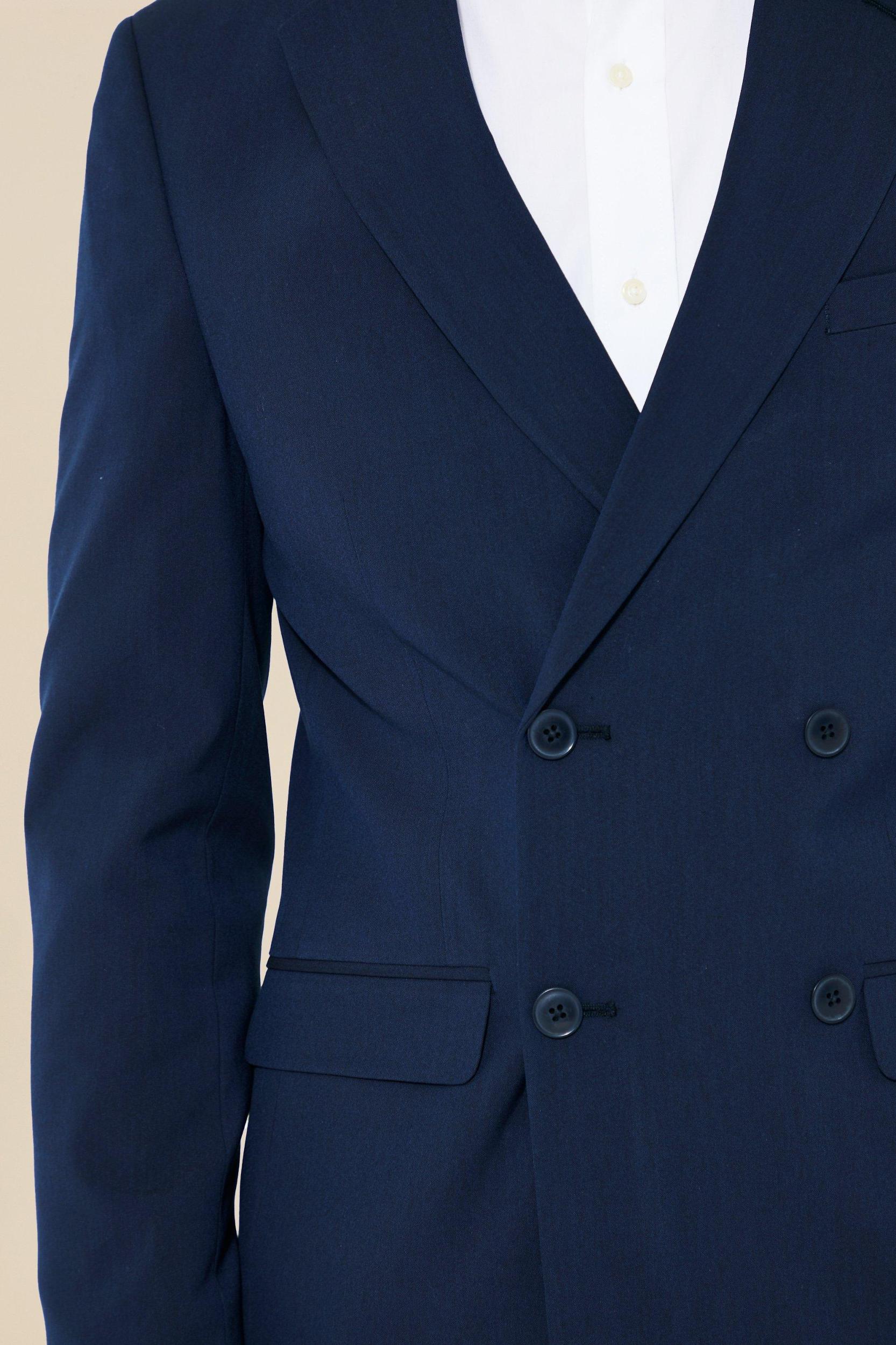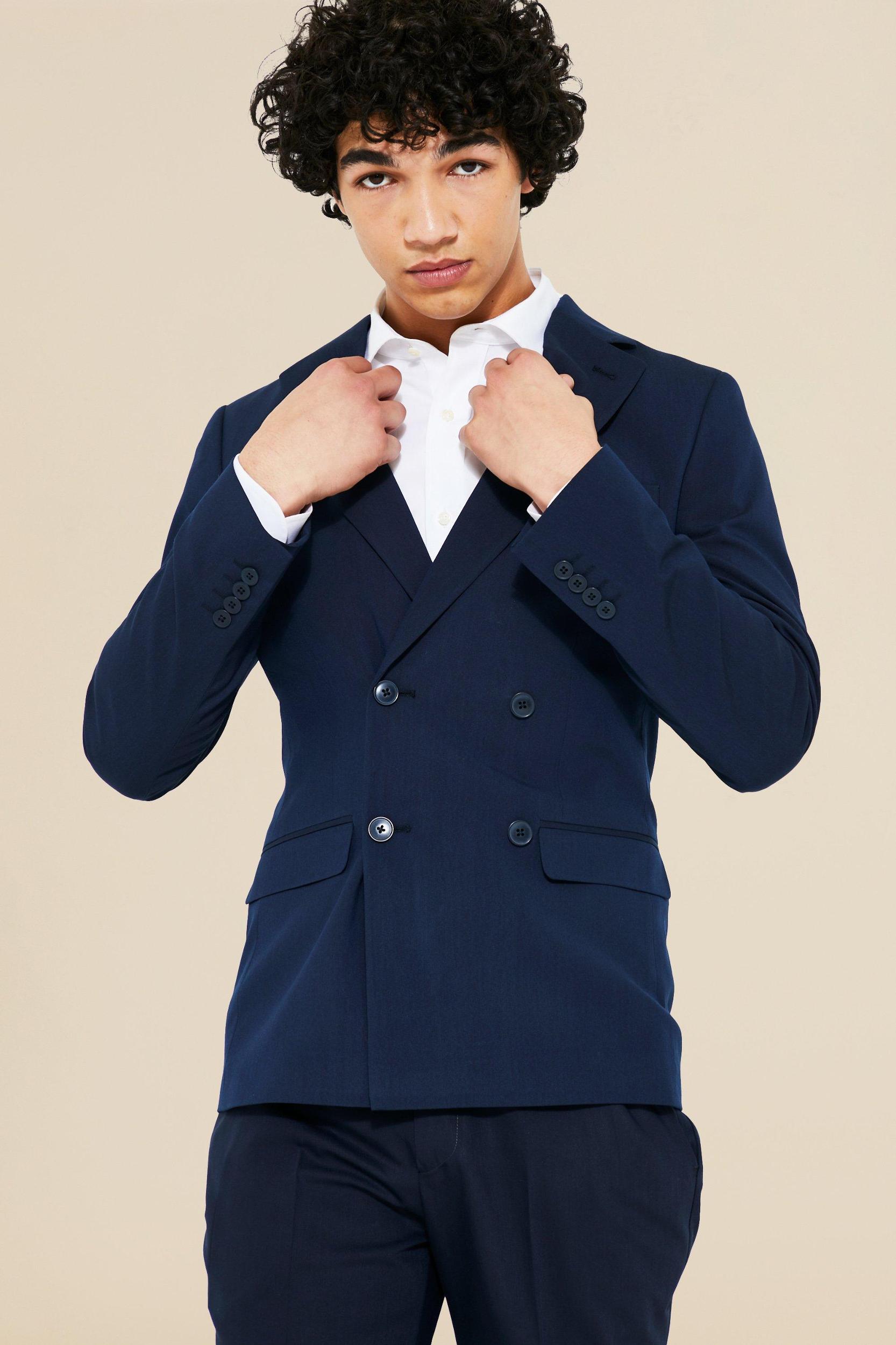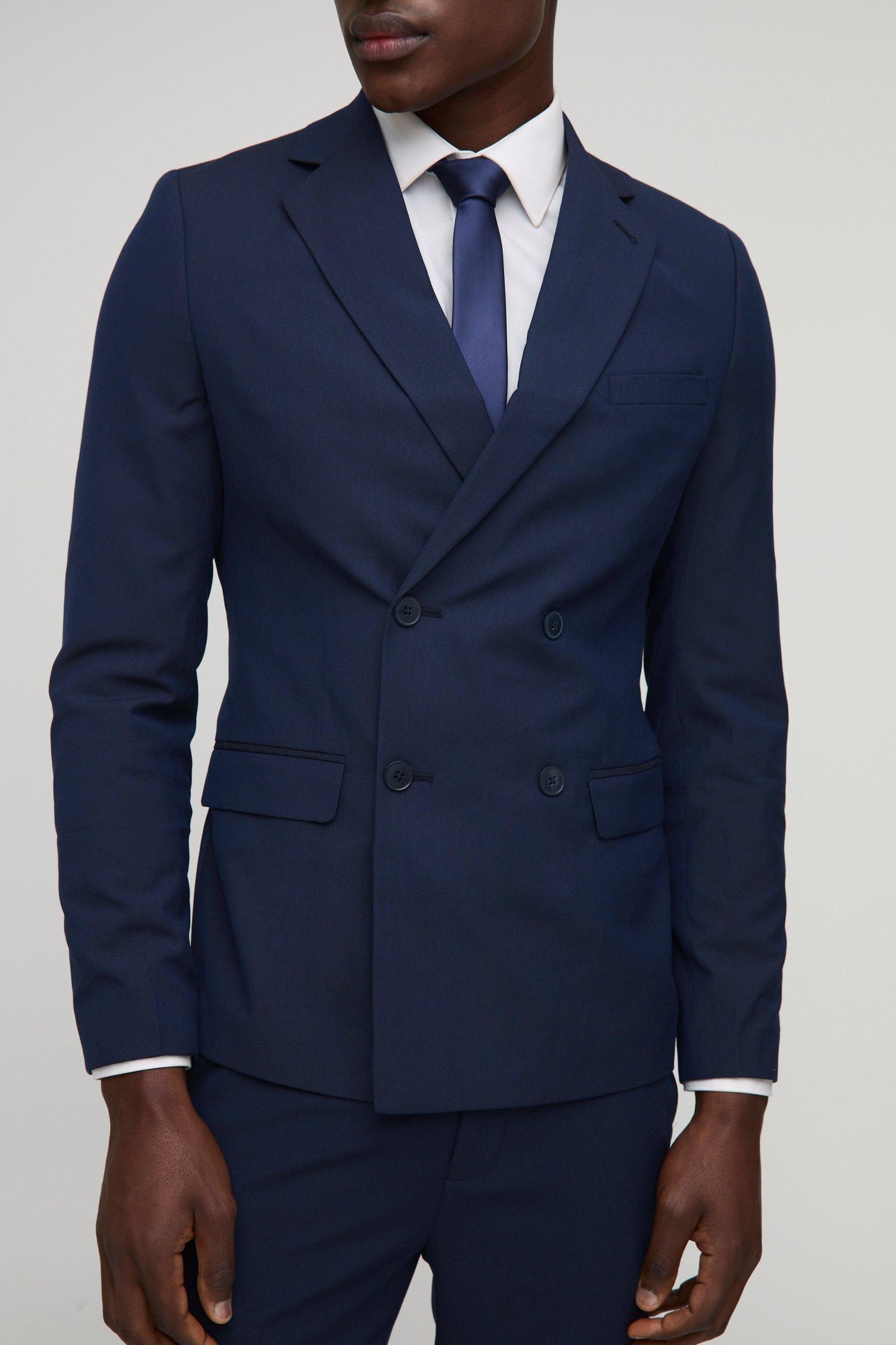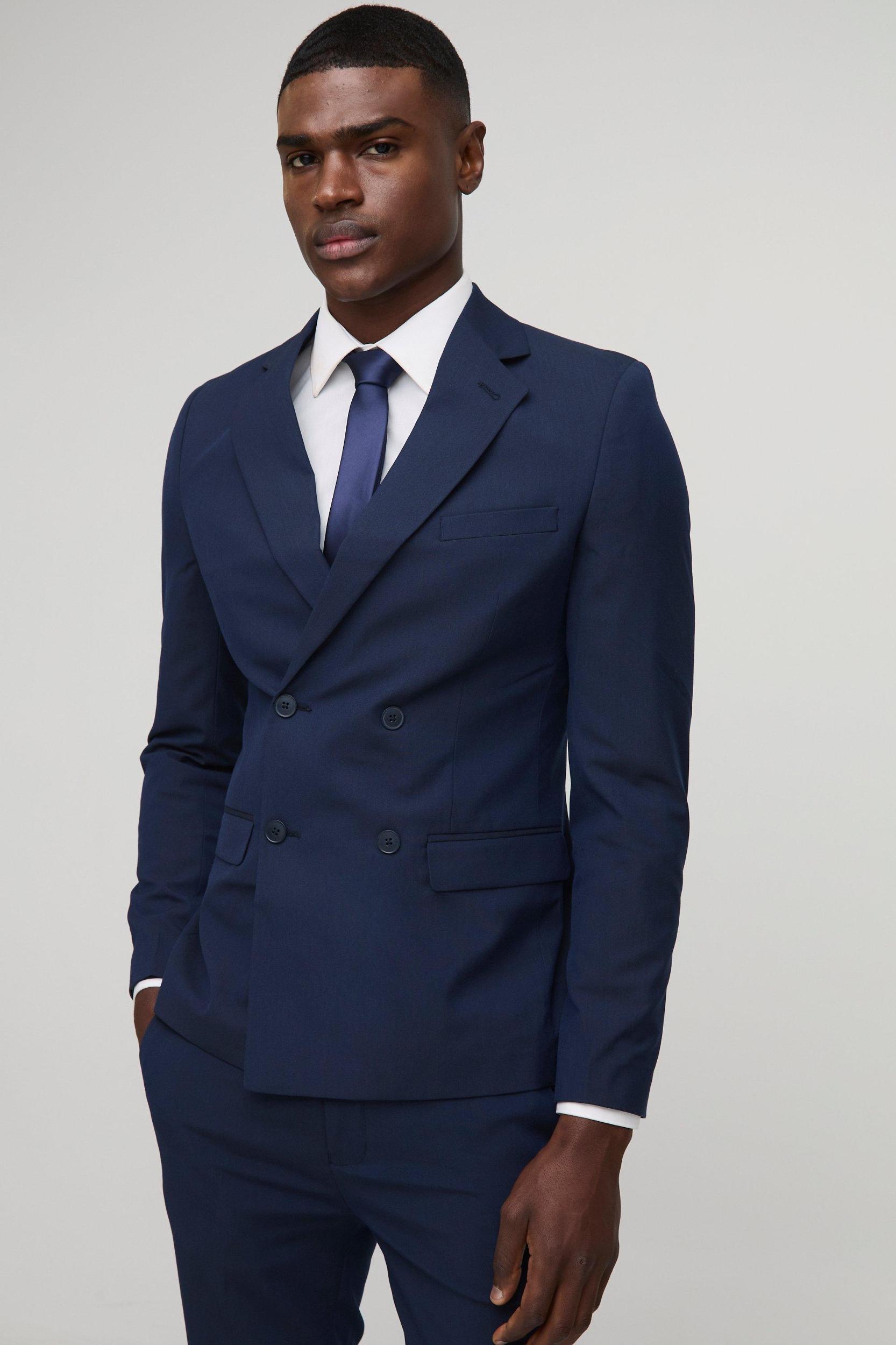 Mens Navy Super Skinny Double Breasted Suit Jacket - Keep out the chill while looking slick in a boohooMAN coat. Rev up your outerwear inventory this season with our unrivalled collection of coats and jackets for men. Whether youre looking for a heavy coat to combat the low temperatures, or a lightweight jacket to stand out while having fun at your favourite festival, weve got the trendiest designs to finish off your outfit with. Puffers, parkas and borg jackets are the perfect choices if you want to bundle up without sacrificing on style, and they look great when teamed up with chunky knitwear, denim and boots. Bombers and overcoats are beyond versatile and can turn any getup from laid-back to dapper in no time. Denim and Harrington jackets cant be missing in your trans-seasonal wardrobe, while cagoules and coach jackets will keep out the chill while youre out and about.Style: Suit JacketDesign: PlainFabric: PolyesterNeckline: CollaredSleeve Length: Long Sleeve