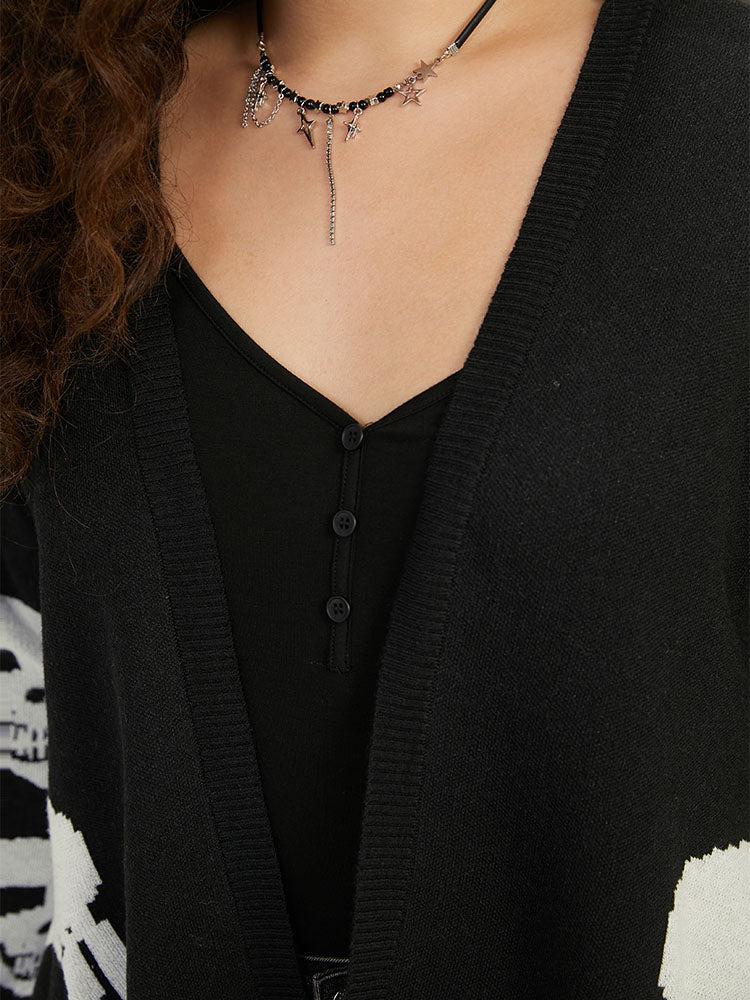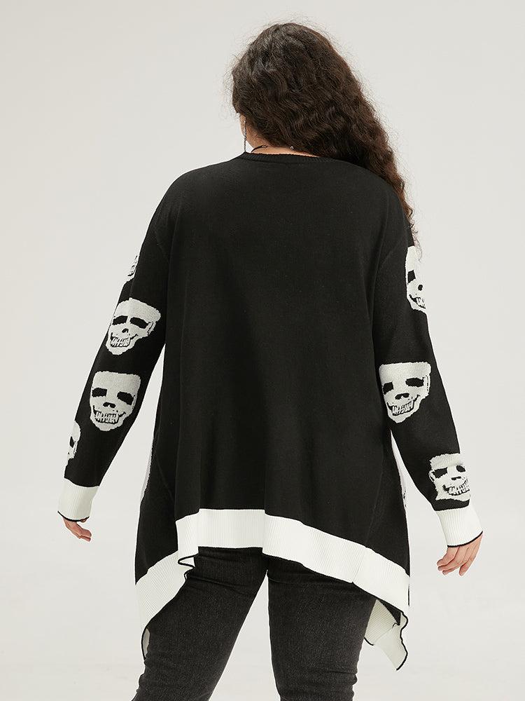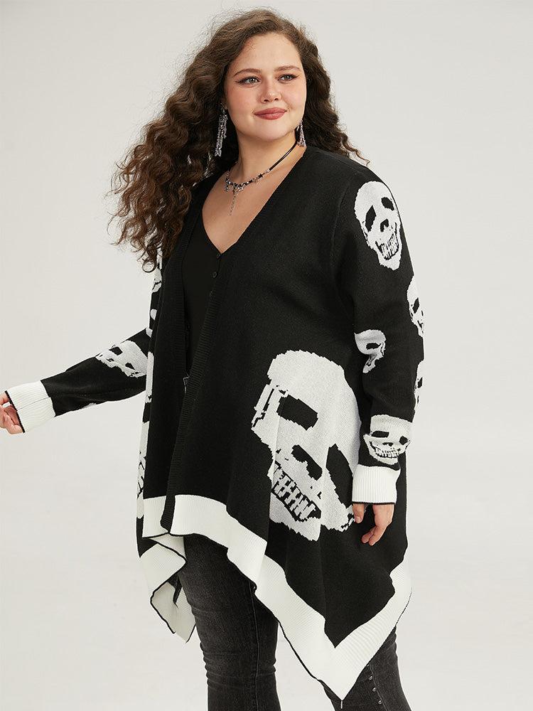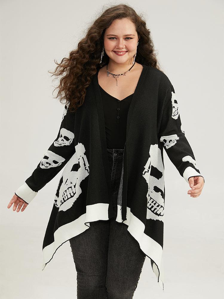 Shop Supersoft Essentials Halloween Skull Asymmetrical Hem Cardigan now and redefine your style with confidence at BloomChic. Tailored for mid and plus-size women. This trendy Sweaters Cardigans Women, sizes 10-30. Features:Soft and perfect for sensitive skin,Anti-pilling;Season:Winter;Color:Black;Style:Casual;Neckline:Open Front;Sleeve Type:Regular Sleeve;Pattern Type:Skull Print, Graphic, Graphic-Halloween;Details:Asymmetrical, Contrast, Elastic cuffs;Pocket:No-pocket;Snap Fastener:No-snap fastener;Belt:No-belt