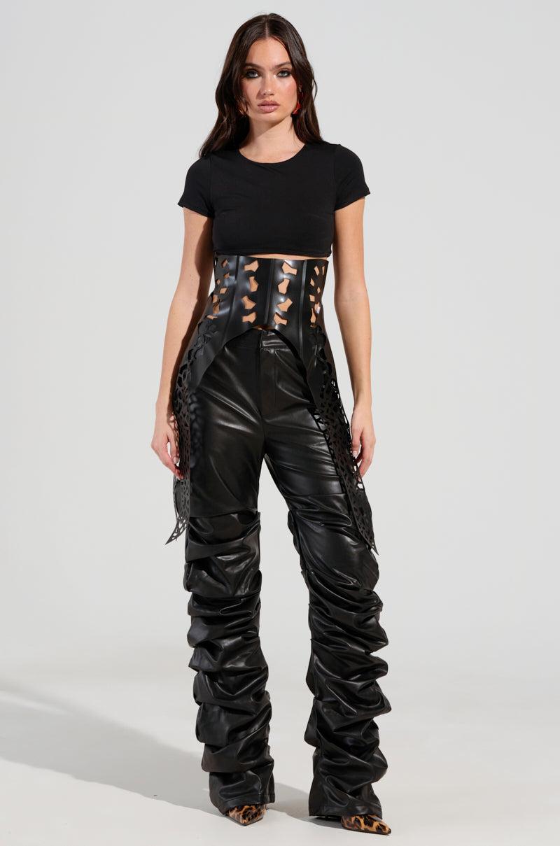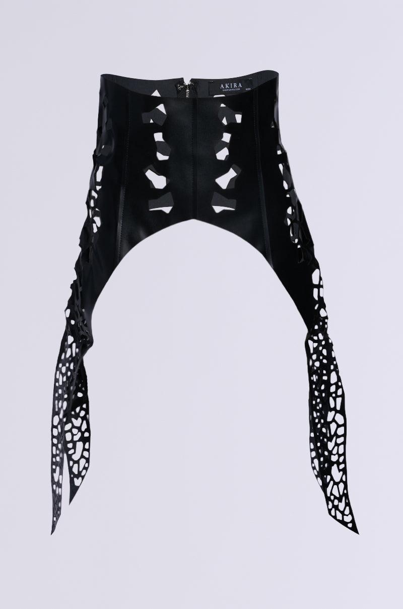 Embrace the spotlight in The AKIRA Label Superstar Laser Cut PU Belt. This edgy accessory is crafted from a non-stretch faux leather base and features a paneled construction with geometric cut-outs throughout, and a faux silver metallic back zipper closure. Complete with extended coordinating strappy detailing that cascades past the cropped hemline. Pair atop baggy tees or button down blouses for some added flair. - Shell: 55% Polyester 45% PU- No Stretch- Imported (all measurements approximate from size S/M)- 13” Belt Width- 6” Waist to Cropped Hem, 26.5” Waist to Extended HemProduct ID: 468108 (all measurements approximate from size 1X/2X)- 16” Belt Width - 6.5” Waist to Cropped Hem, 27” Waist to Extended HemProduct ID: 468110
