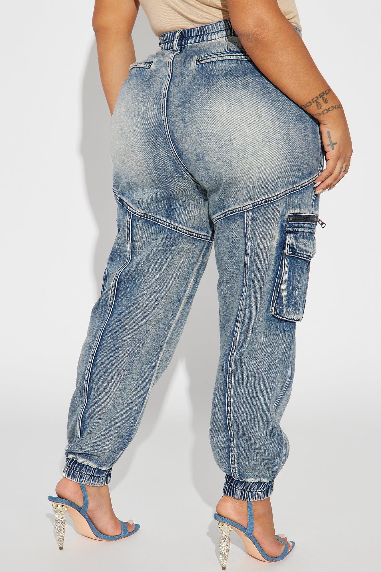 Available In Medium Wash. Denim Jogger Non Stretch Tinted Cargo Pockets Seam Detail Elastic Hem Elastic Back Waistband 28" Inseam 11.5" High Rise Disclaimer: Due To The Specialized Wash & Distressing Process, Each Garment Is Unique 100% Cotton Imported California Proposition 65WARNING: Cancer and Reproductive Harm - www.P65Warnings.ca.gov.