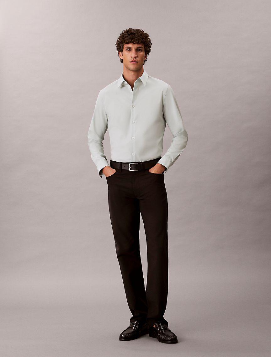 Crafted from a supima cotton stretch blend for premium flexible comfort, this woven shirt is a refined silhouette with solid styling. Cut in a slim fit with button-front closures for an elevated and versatile Calvin Klein essential.